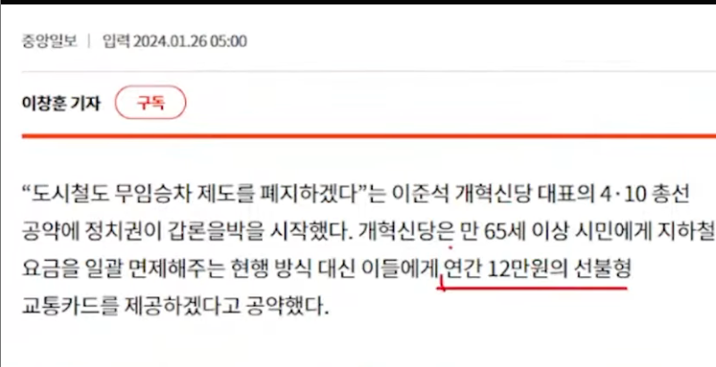 우리 이준석의 말도 “도시철도 무임승차 폐지”를 하겠다고 함 뭐 시각에 따라서 이를 젊은 세대의 표를 노리고 진행 했을 지도 모르겠지만 여기서 핵심은 “연간 12만원의 선불형 교통카드”를 제공하겠다는 말은 폐지보다는 개정이 이라는 표현이 더 맞음