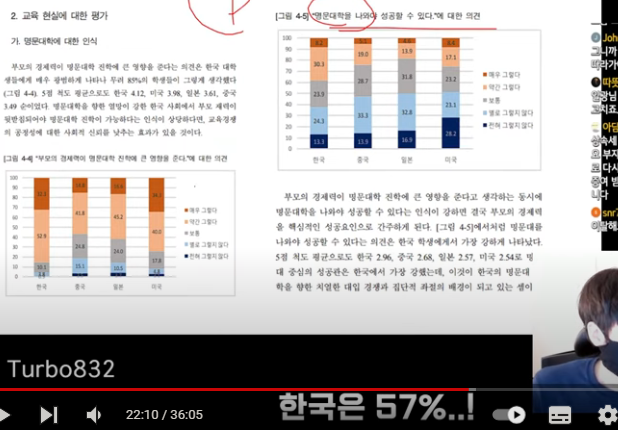 교육에 현실에 대한 의견에서 무려 57%나 명문대학을 나와야 성공할 수 있다고 했다.