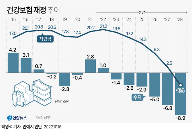 그렇게 잘 돌아가는 줄 알았는데 문재인케어로 보험 영역이 급속도로 확장되서 큰폭의 적자로 돌아섰다. 물가 상승률 훨씬 상회하는 속도로 건보를 올린 결과이다. 막대한 지출을 했음에도 병원을 이용하는건 여전히 어렵다. 응급실은 환자를 돌려보내고 소아과를 오픈런하기 시작했다.