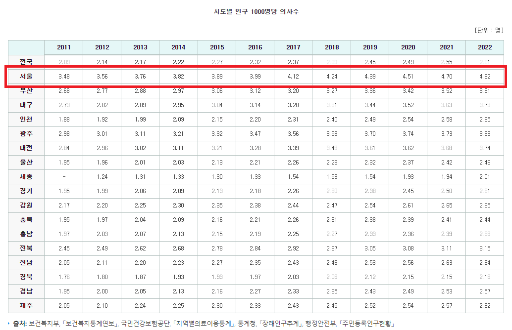 물론 국민 당 의사수는 평균보다 낮으니까 늘어나야 하지만 10년전 비하면 타 나라 대비 개선되고 있고 서울의 경우 OECD 평균보다 높음에도 국민들이 느끼는 의료 서비스의 질은 악화되고 그 핵심은 서울임