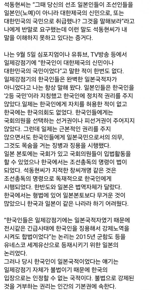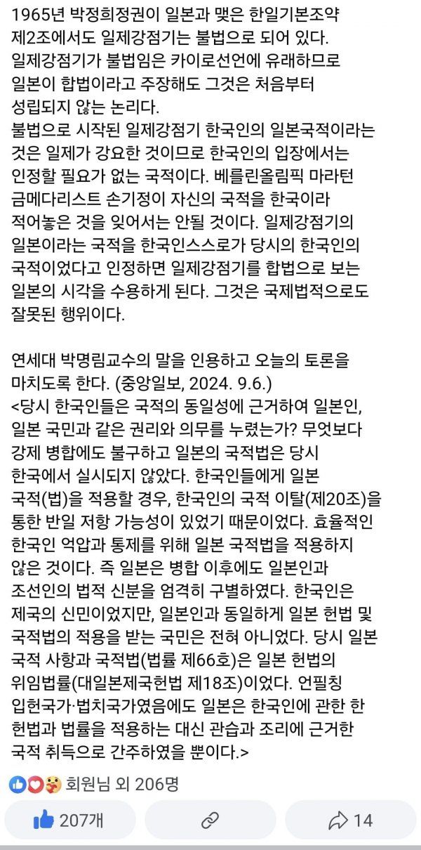 “일제강점기의 일본이라는 국적을 한국인 스스로가 당시 한국인의 국적이라고 인정하면 일제 강점기를 합법으로 보는 일본의 시각을 수용하는 꼴이 된다”