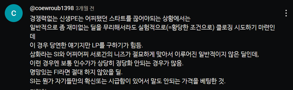 - 아마 이게 공감이 가는게 어찌 되었던 신생 PE는 스타트를 끊어야되는데 좀 무리해서 클로징을 한듯.. SI(삼화식품)이 뭔가 확인이 있는 것 같기는 함