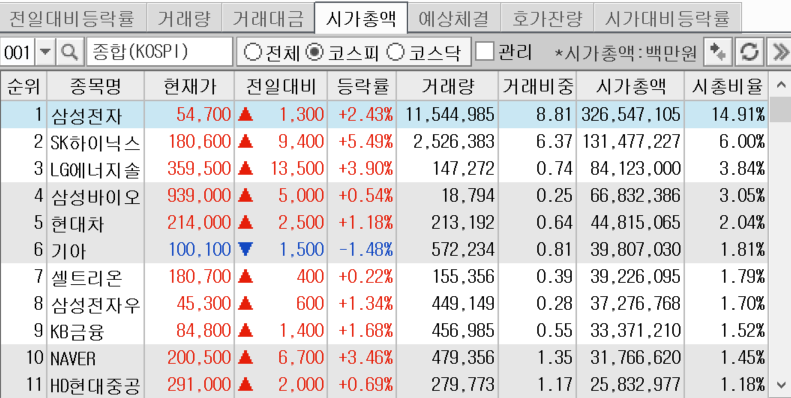 코스피 상위 종목들을 보면 은근 외인들이 많이 들고 있는 주식들이 보입니다. 이게 뭔소리냐면 한동안 침체장에도 선별해서 알아서 외인들은 들어가는 있었다는 겁니다. 특히 네이버가 제일 많이 산 것 같습니다.
