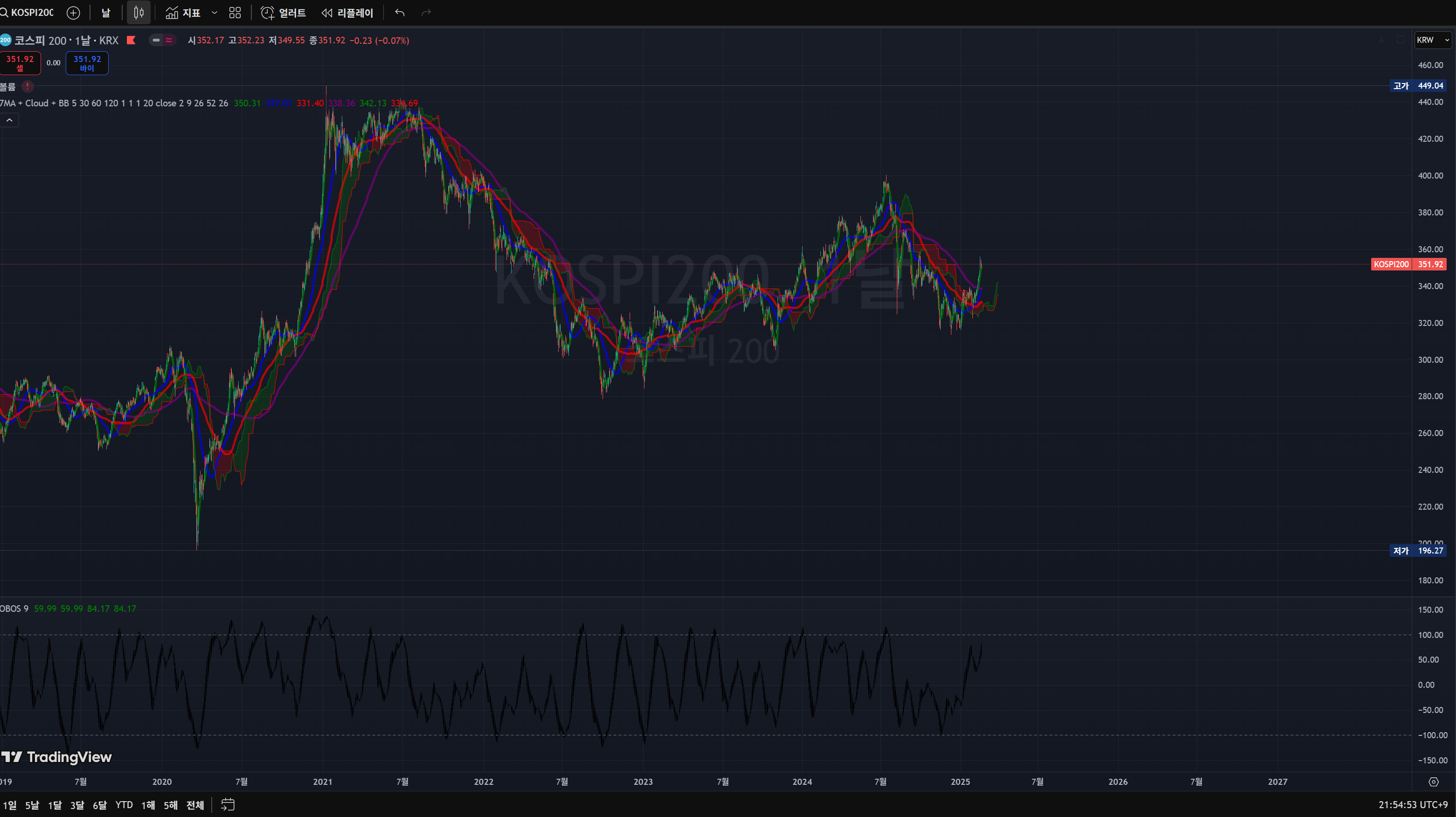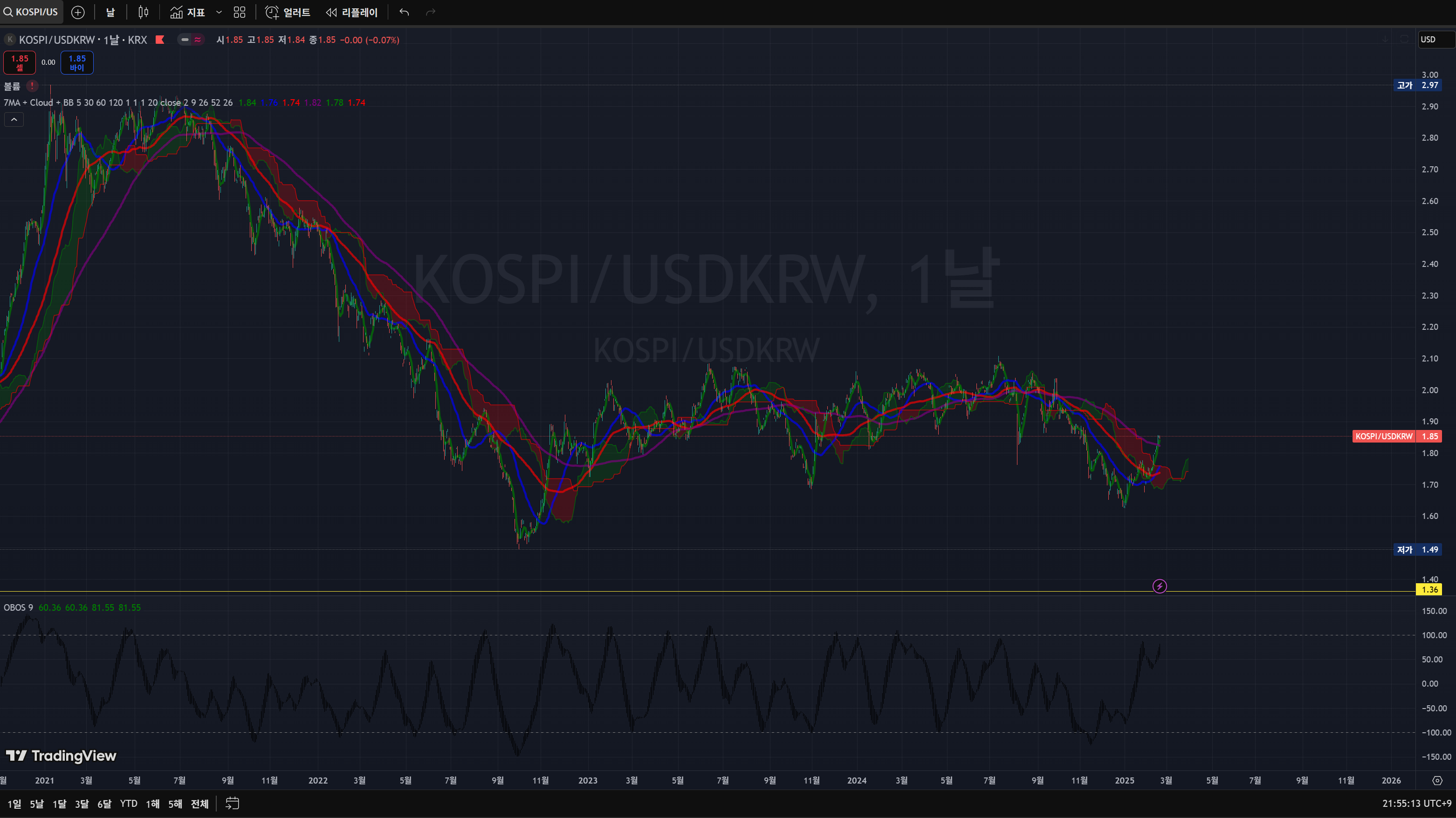저는 조정이 있을 수는 있으나 큰 방향은 상방이라고 보고 있습니다. 2600이 아마 새로운 지지선이 되지 않을까 싶습니다. 이는 USD/KRW와 KOSPI의 동일한 지지 자리를 기준으로 산출했습니다. + 감