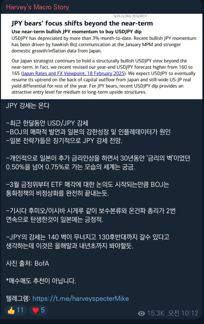추가적인 이슈로는 Bofa의 USDJPY 콜이 있는데 이게 좀 무섭긴 합니다. 근데