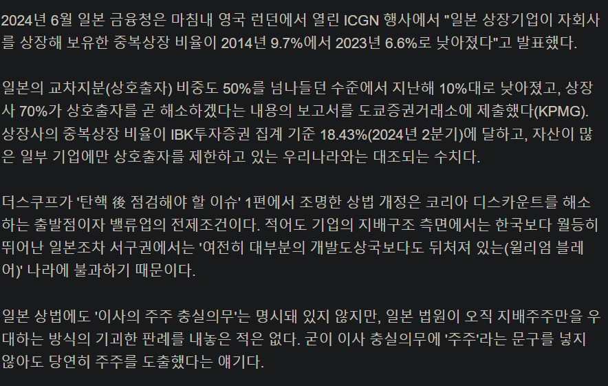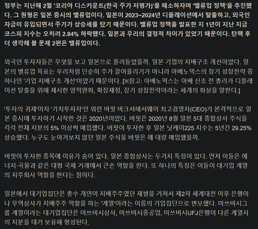 정부의 “코리아디스카운트” 정책은 실패했다. 그리고 이 정책의 원형은 일본의 “벨류업”인데 일본 증시는 화려하게 성공했다. 이 성공과 실패의 차이는 대체 뭘까?