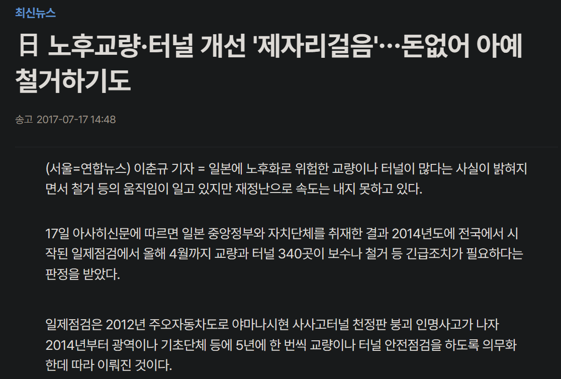 일본의 고령화사회는 이미 심화되어서 인구외에 예상치도 못한 사회문제가 발생하고 있는데 바로 사회인프라 문제입니다.