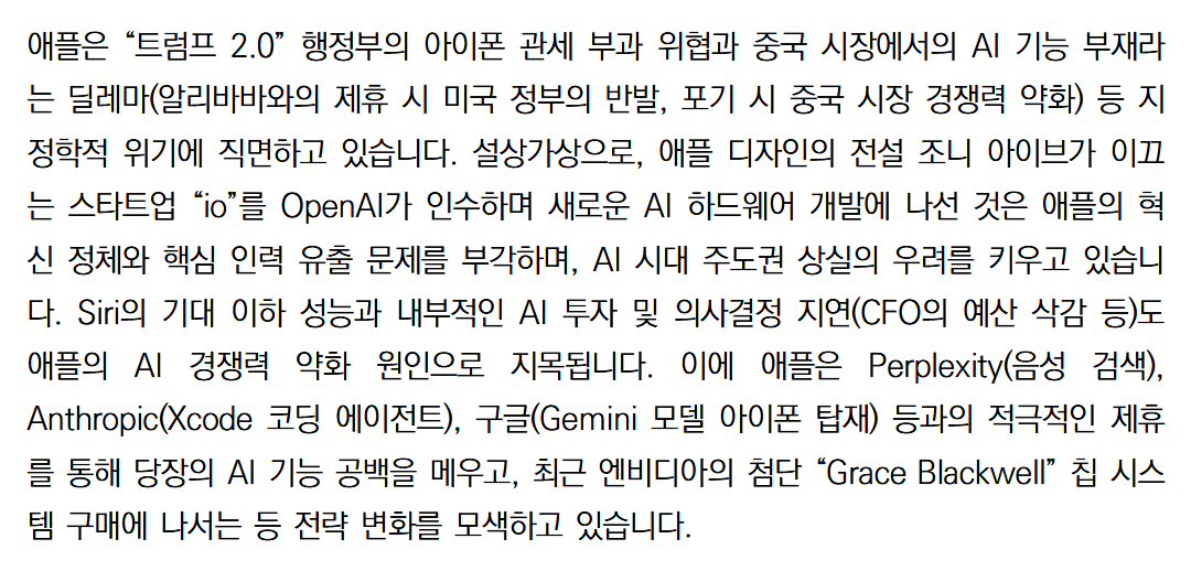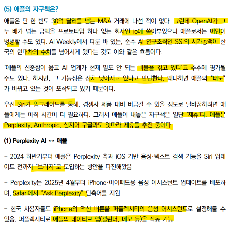 물론 애플의 신중한 선택으로 인해 AI 버블인 상태여서 행동을 안하는 것 일수도 있지만 최근 태도가 바뀌고 있다.