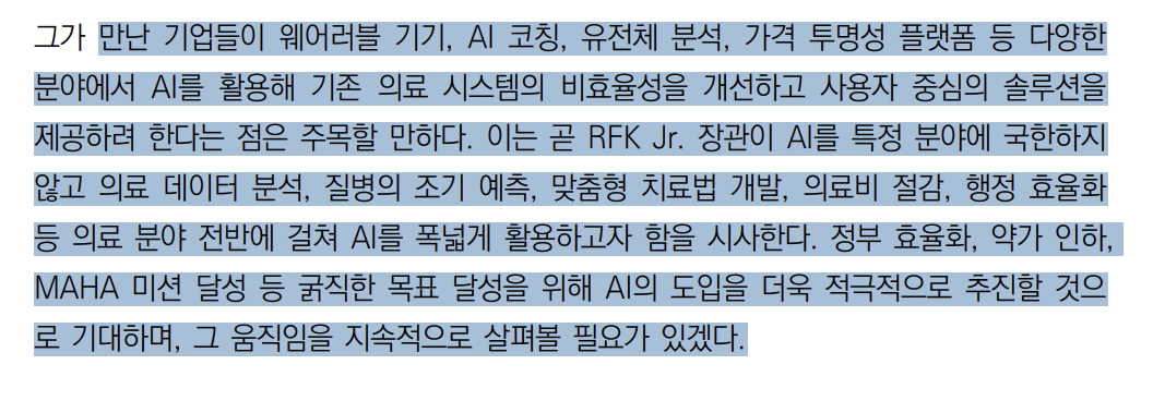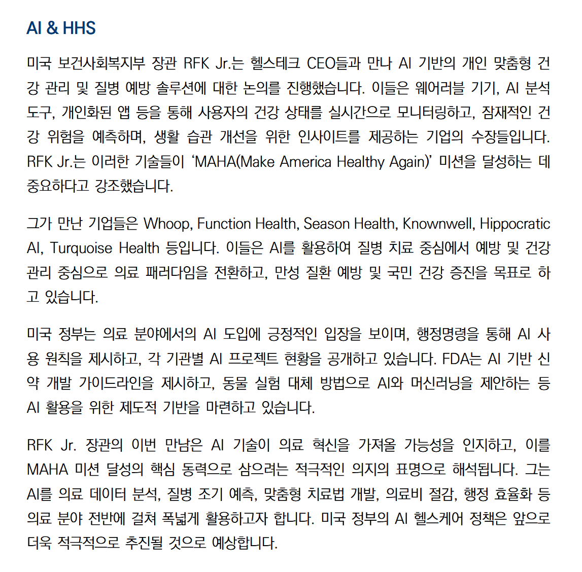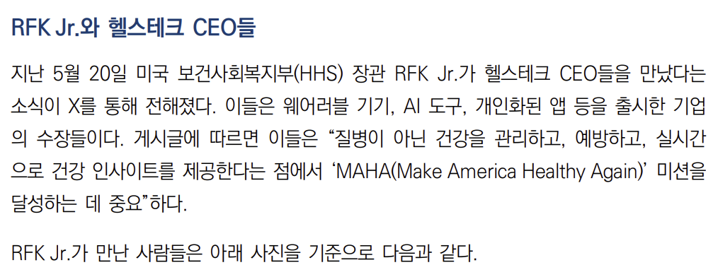 최근의 HHS 장관이 헬스테크 CEO들을 만났는데 이들은 웨어러블기기, AI도구, 개인화된 앱 등을 출시한 기업들의 수장이다.