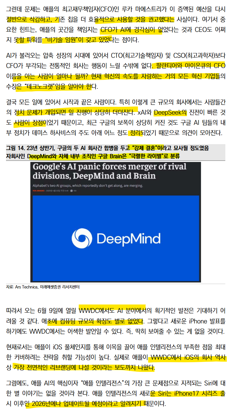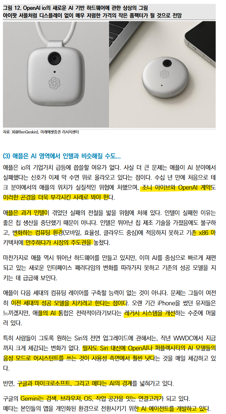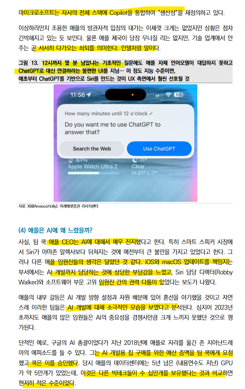 애플은 인텔의 길을 걷고 있음 변화하는 컴퓨팅 환경에 적응하지 못하고 x86 아키텍쳐에 안주하다가 시장의 주도권을 놓쳤음 (ARM) 애플의 Siri는 체감되는 변화는 없고 다른 AI는 말도 안되는 속도로 발전하고 있음.