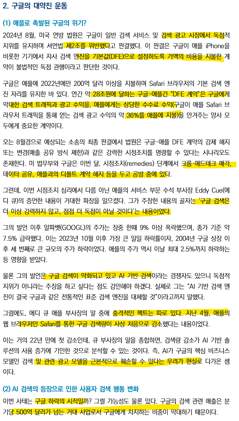 하지만 애플의 부사장은 구글의 검색이 약화되고 있다 AI 기반 검색으로 인해 구글의 지배력이 떨어질 것이라는 보고서를 작성했다. 심지어 이는 팩트가 하나 있었는데 바로 애플의 safari를 통한 구글 검색량이 사상 처음으로 감소 햇따는 것이다.