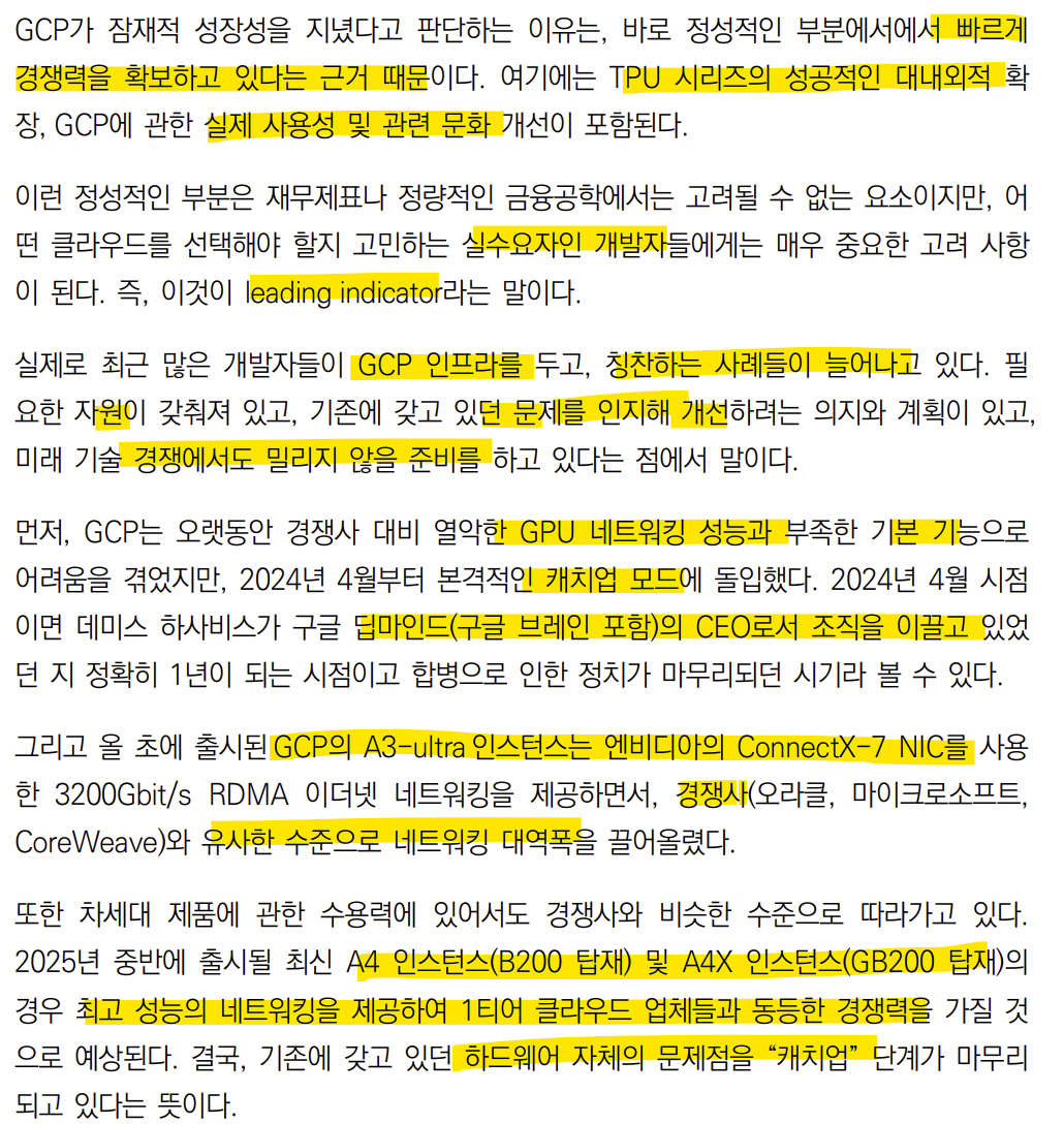 GCP가 잠재적 성장력이 있다고 판단한 이유는 최근에 거의 “캐치업”이 완료되었고 기존 문제를 인지하고 개선 그리고 기술 경쟁에서도 밀리지 않을 준비를 하고 있다는 점이다.