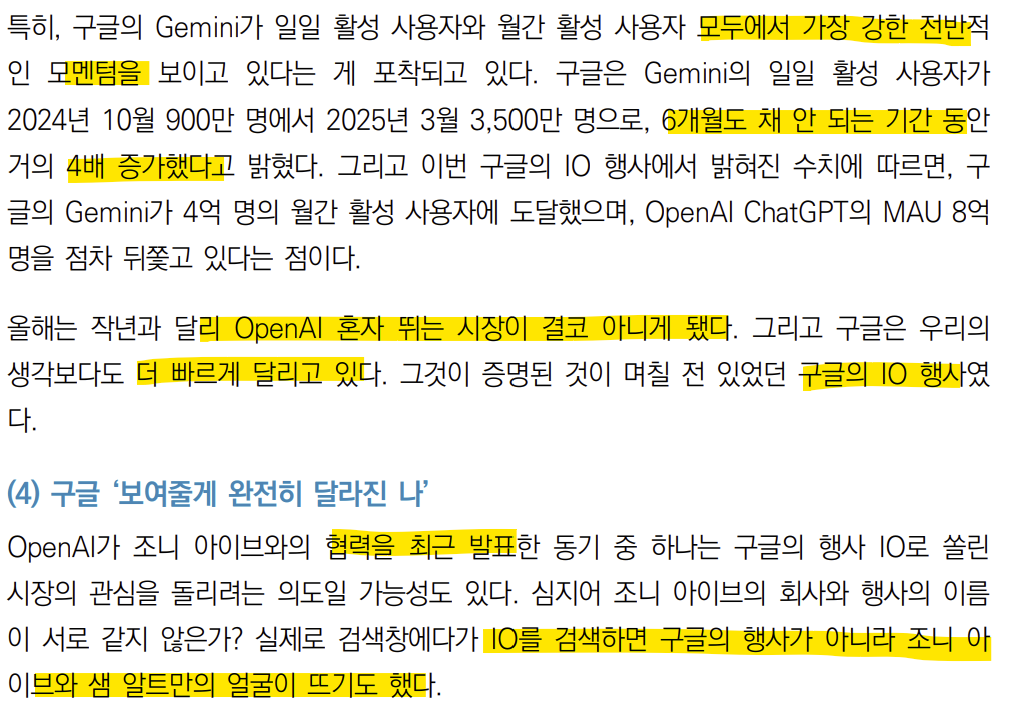 Gemini는 강력한 모멘텀을 보이고 있고 올해는 작년과 달리 OpenAI 혼자 뛰는 시장이 아니게 되었다.