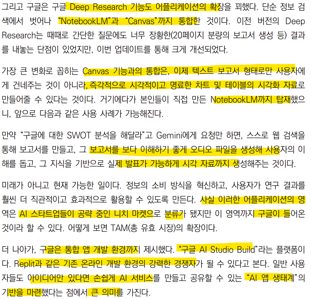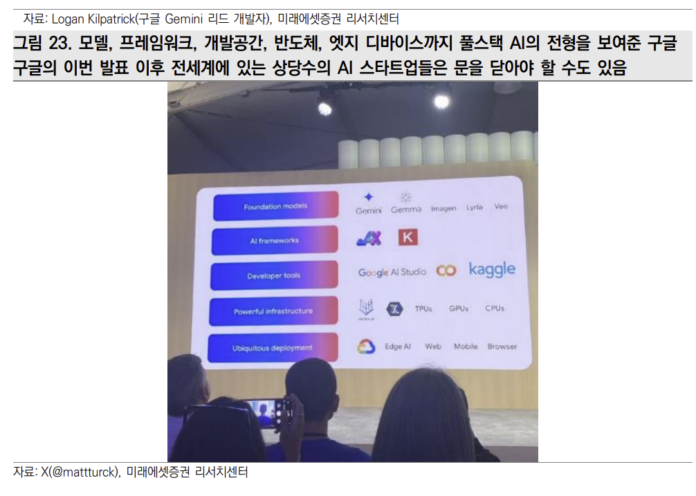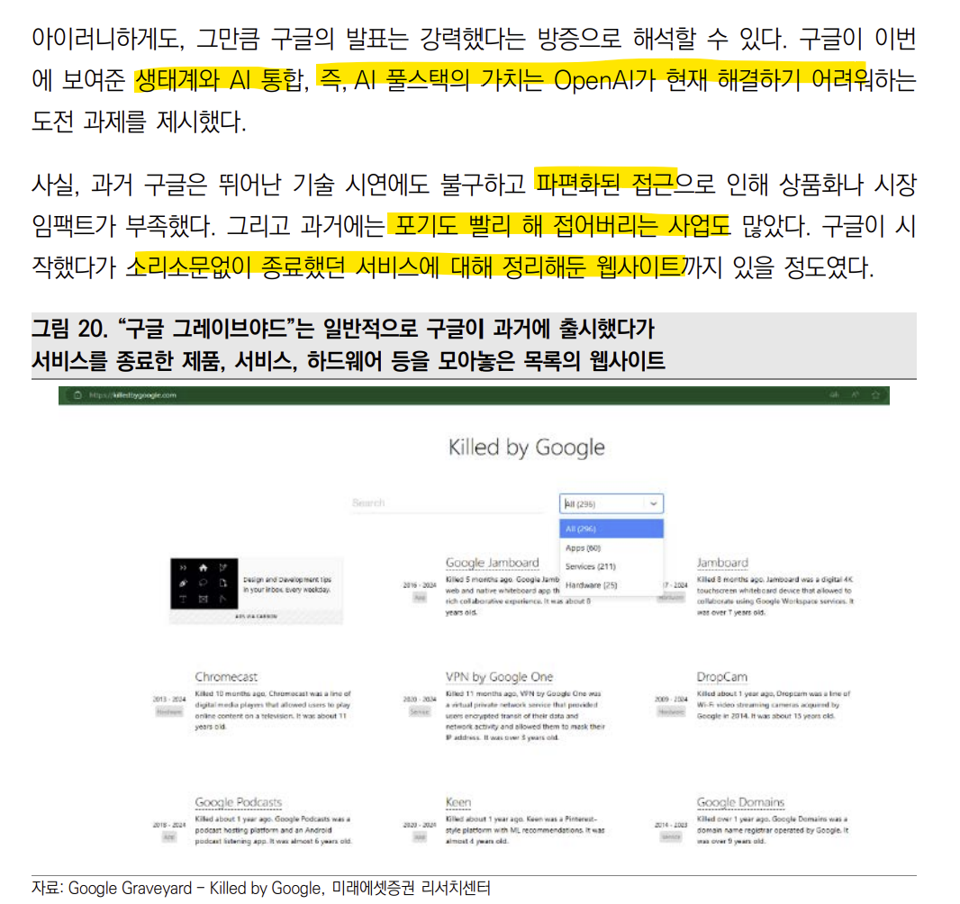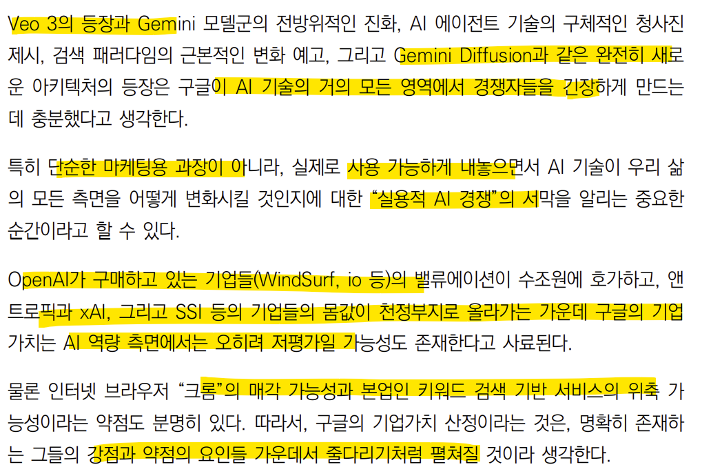 구글이 이번 IO에서 보여준 것들은 기존 자신들의 생태계와 AI의 통합 즉 “풀스택”이다 이는 OpenAI가 불가능한 영역이다. 과거 구글은 뛰어난 기술이 있음에도 불구하고 파편화된 접근으로 인해 임팩트가 부족했었다. 즉 포기도 빨리해 접어버리는 사업도 많았다.