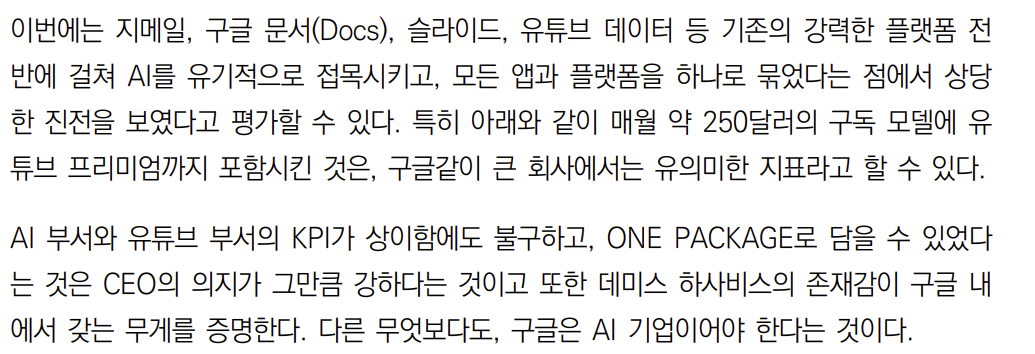 이제 사람들은 AI로 인해 “제로 클릭” 검색 트렌드로 변화하고 있다. 이는 구글에게 심각한 위협인데 바로 기존 광고 사업 모델에 큰 문제가 발생하기 때문이다. 그렇기에 구글은 새로운 수익 모델을 찾아야하는데 그것이 바로 Gemini 구독이다. 가장 중요한 것은 AI 모델의 성능인데 구글의 Gemini는 충분하다고 생각한다. 필자 역시 이 말에 동의하는데 Gemini 2.5 Pro를 쓰며 이미지 생성 외에 불만족 스러웠던 점은 한번도 없었다.