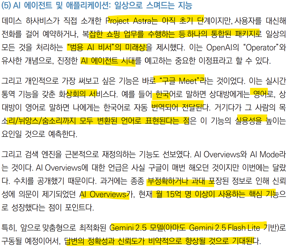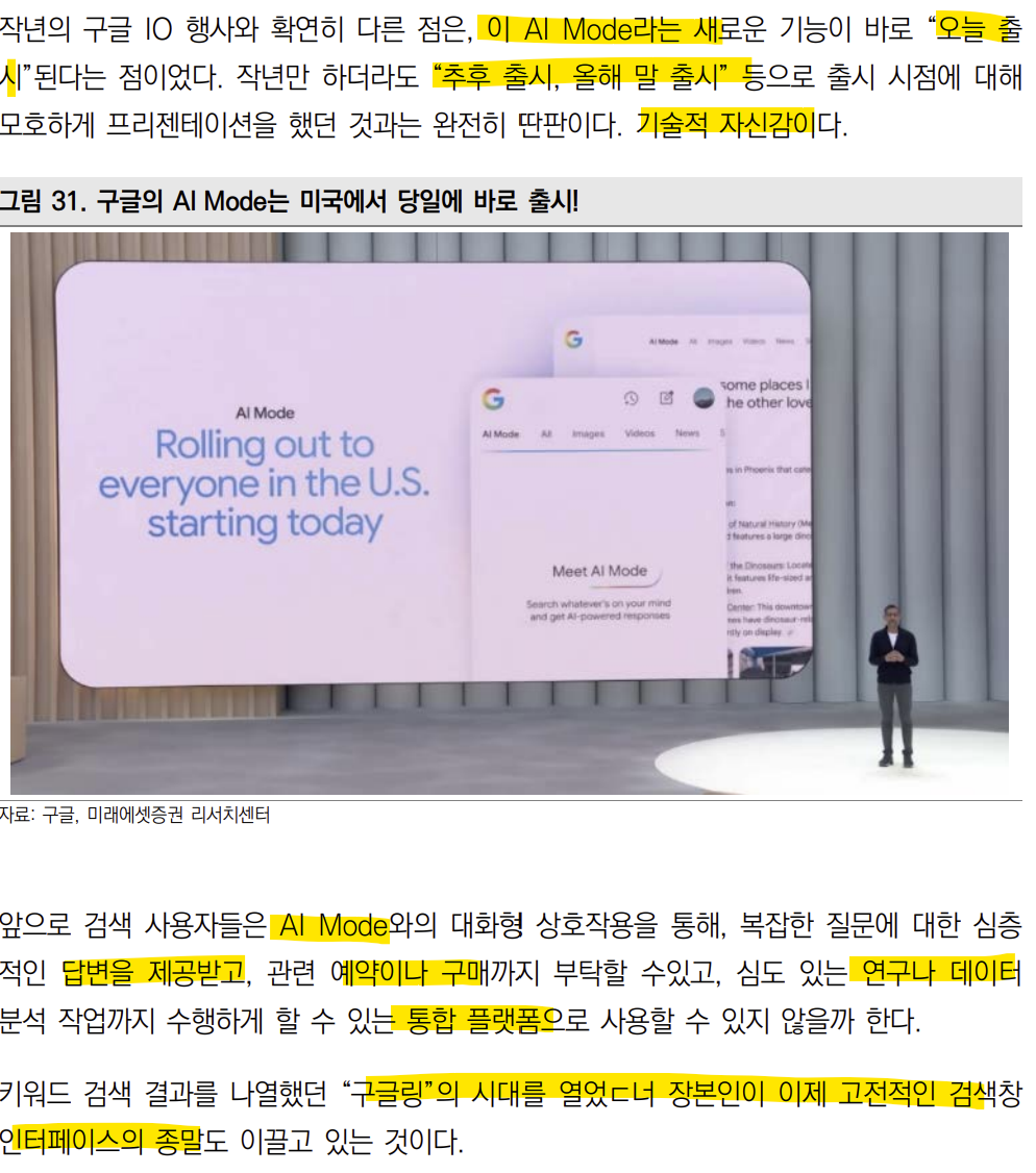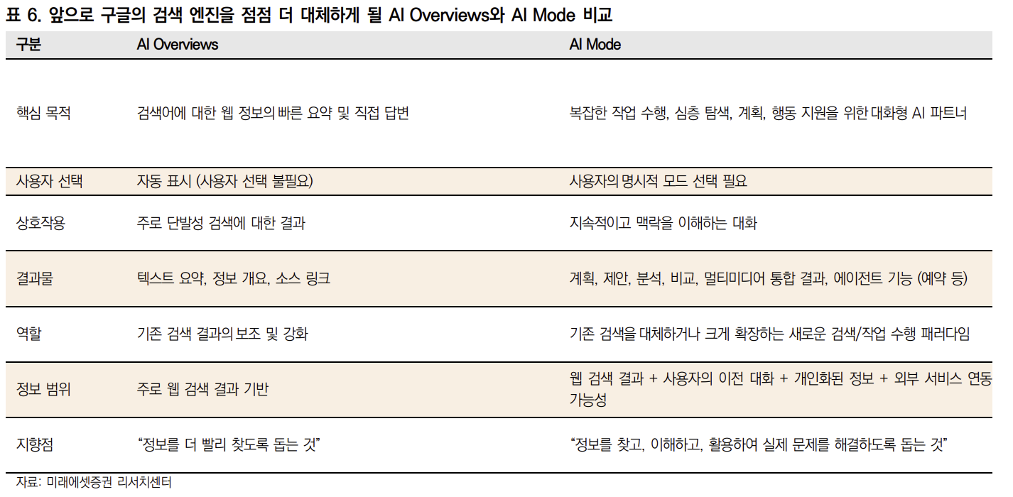 AI Mode와의 대화형 상호작용을 통해 복잡한 질문에 대한 심층적인 답변을 제공받고 예약이나 구매 연구나 데이터 분석 작업까지 수행 할 수 있는 통합 플랫폼으로 사용될 수 있을 것이다.