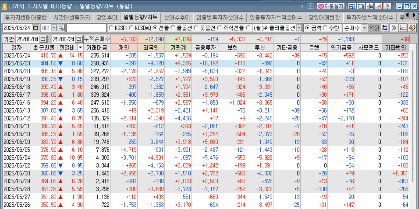 1조 매수가 들어온 날을 기준으로 지금 외인은 4.3조의 현물을 가지고 있습니다.