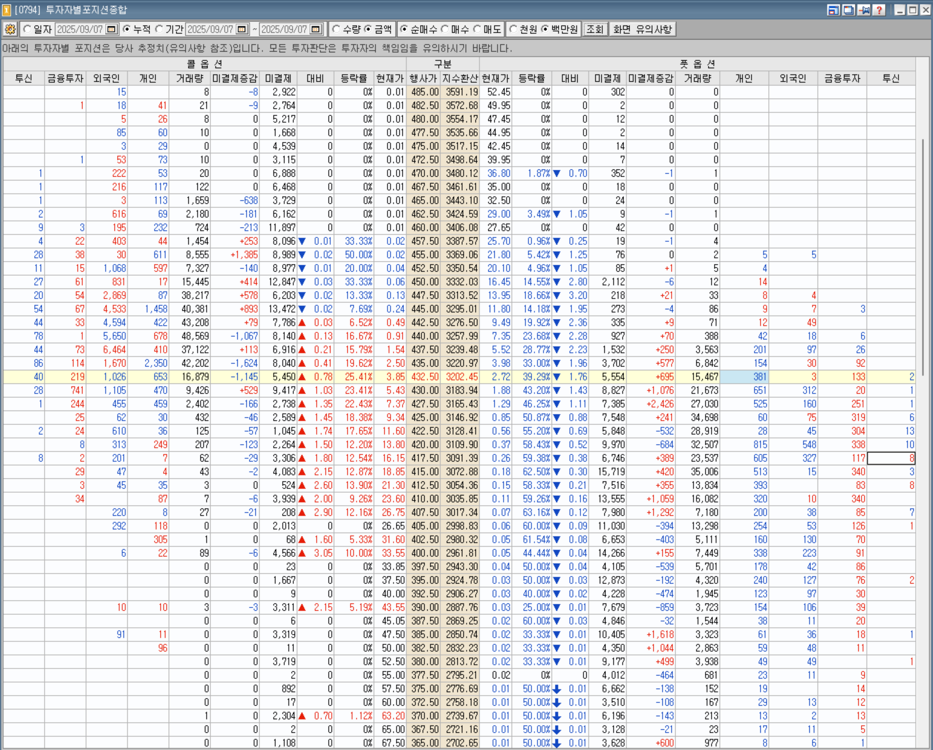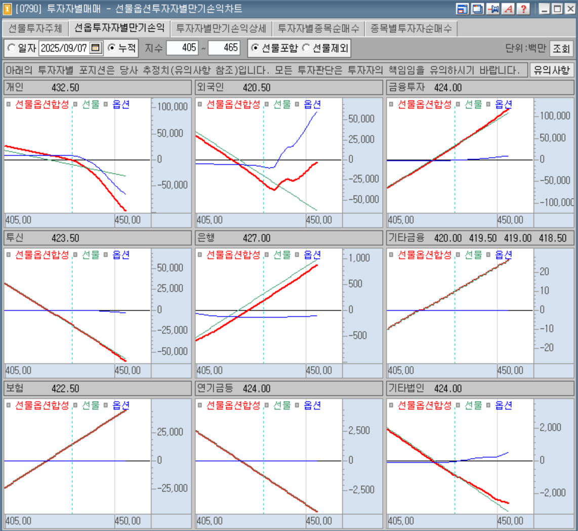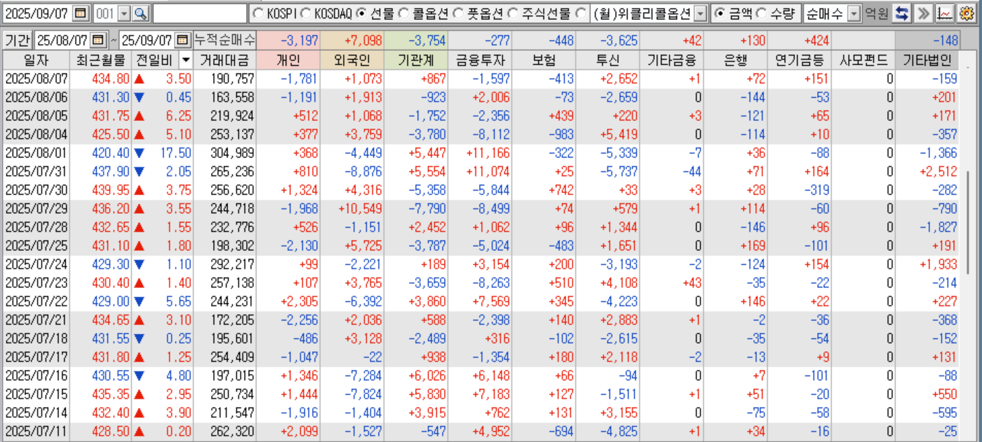 일단 외인은 양매도가 맞는 것 같습니다. 금투는 현물을 많이 들고 있는 것으로 알고 있습니다.