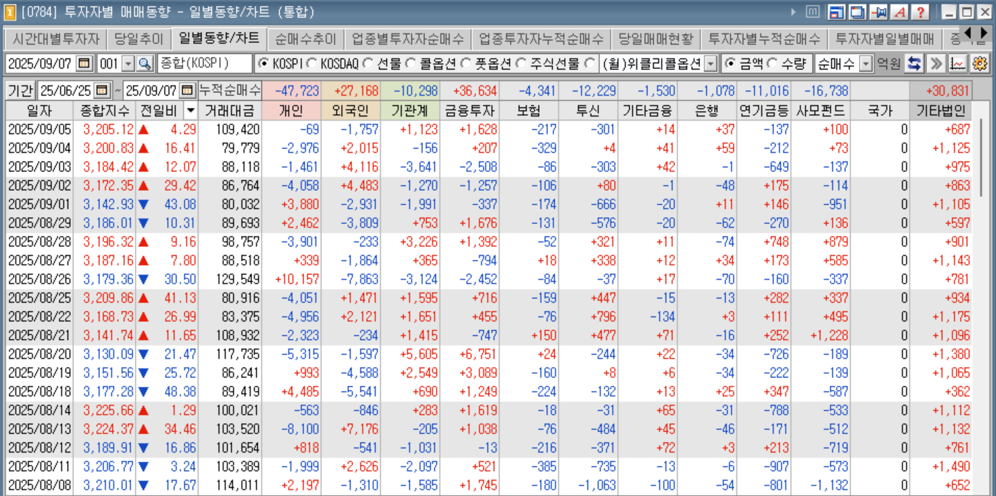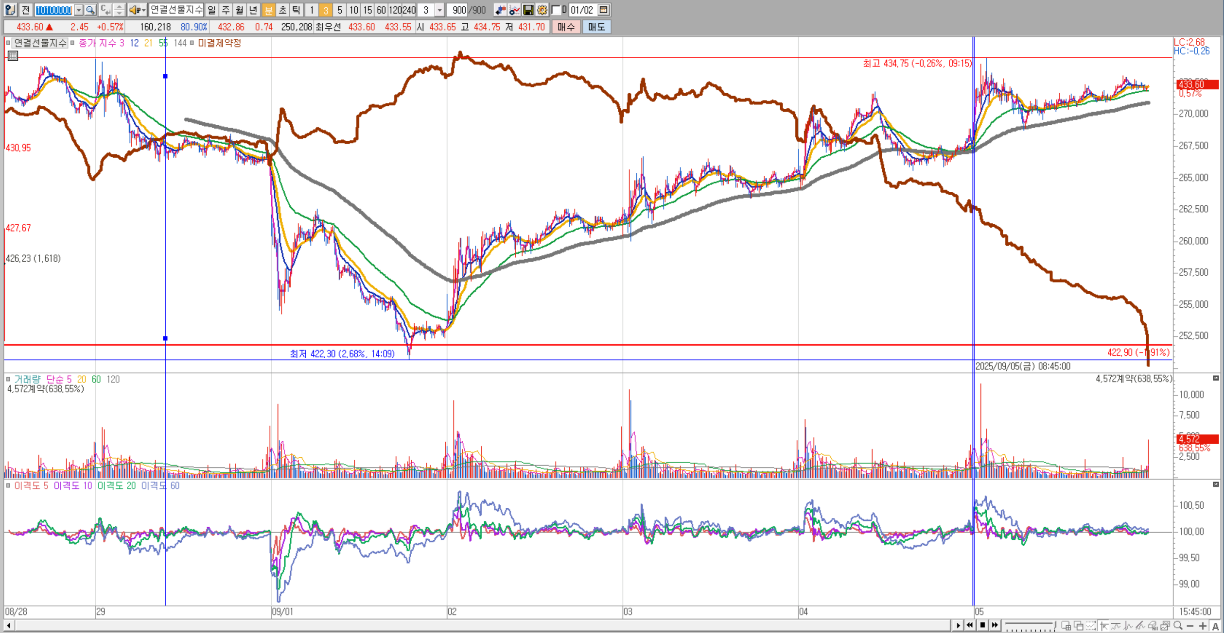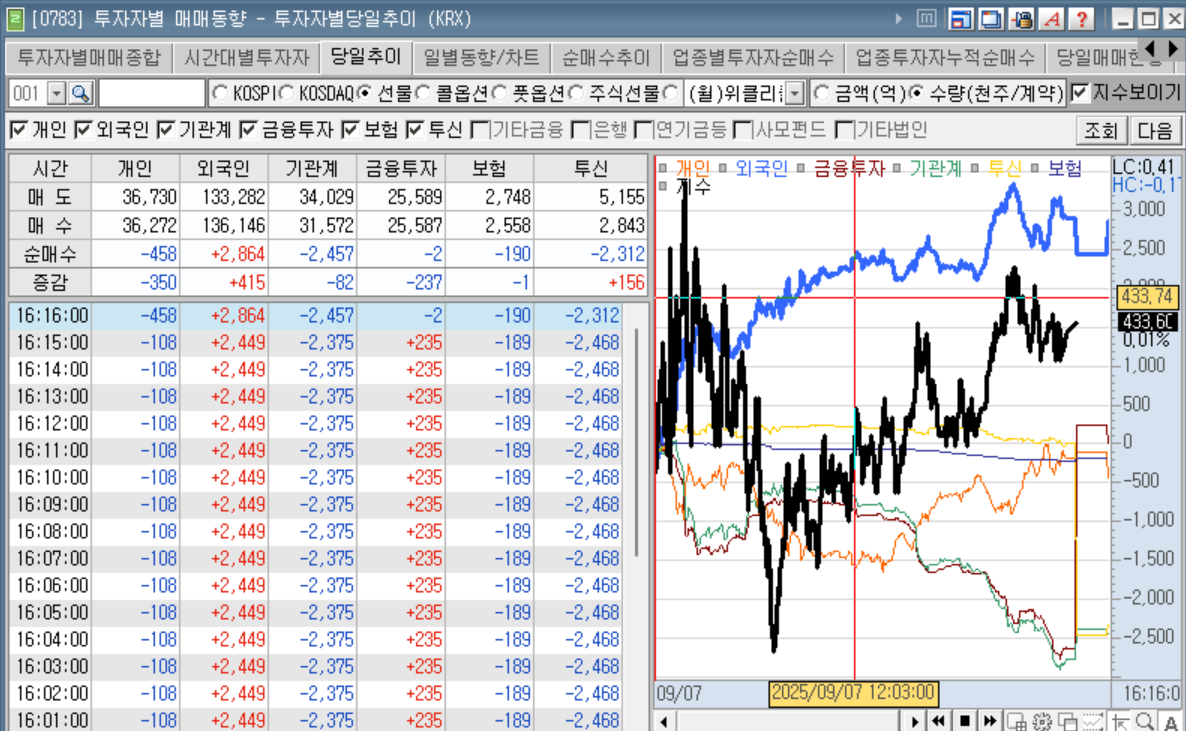 일단 외인은 양매도가 맞는 것 같습니다. 금투는 현물을 많이 들고 있는 것으로 알고 있습니다.