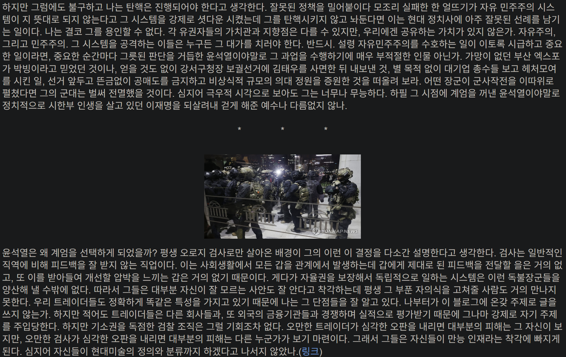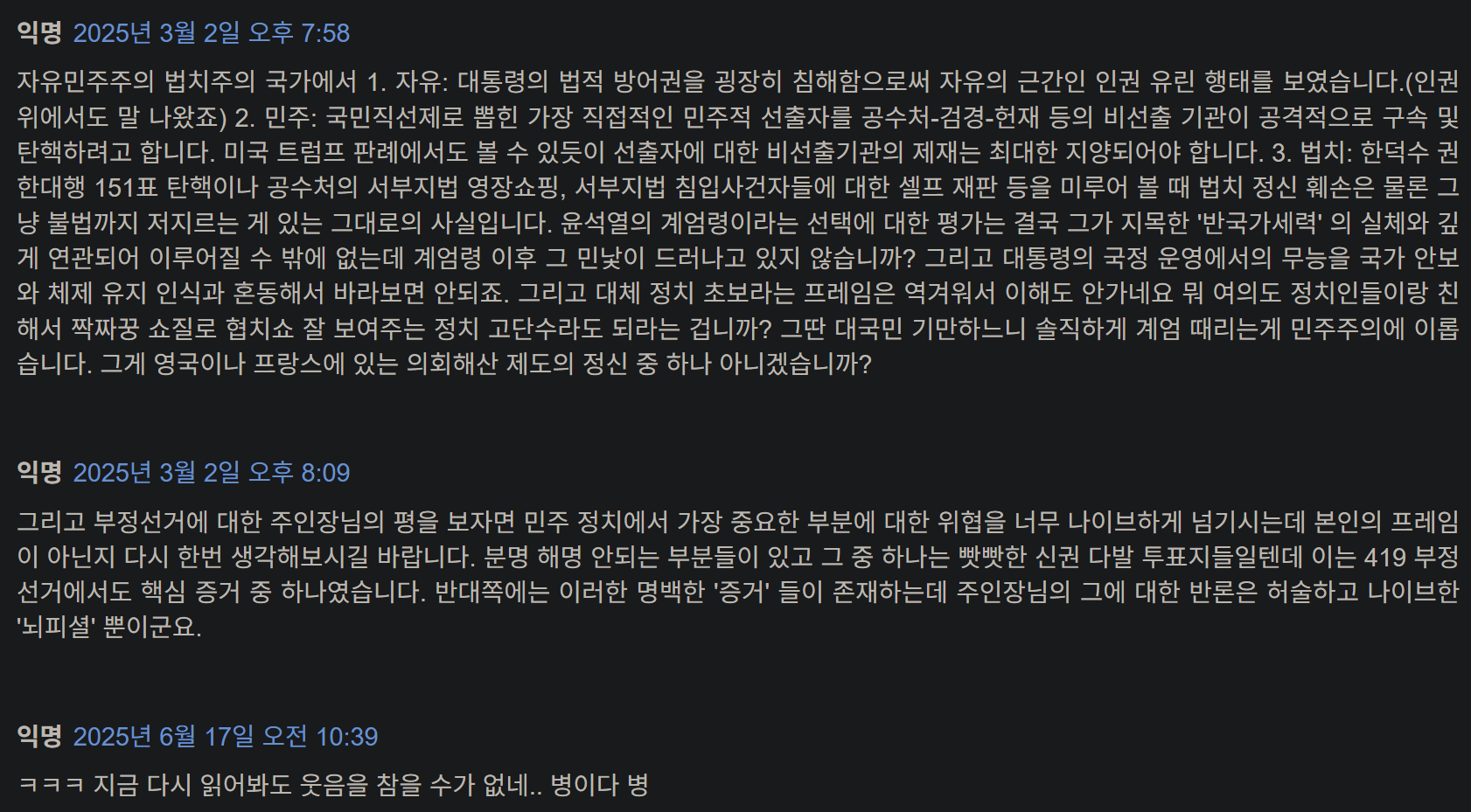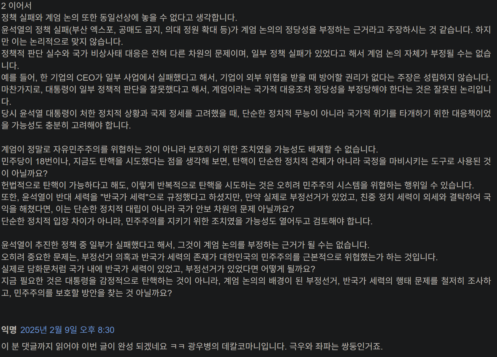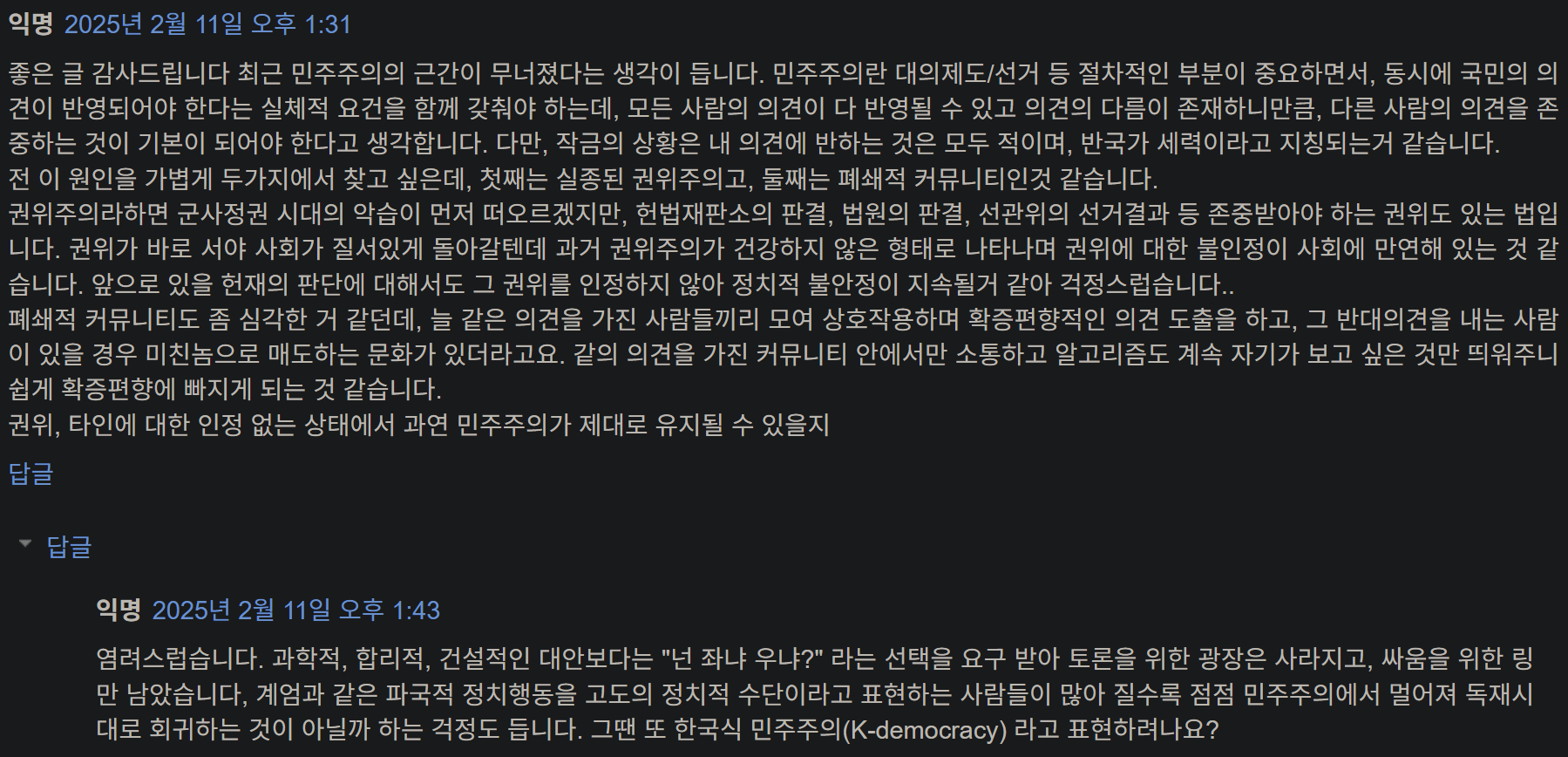 과학적, 합리적, 건설적인 대안보다는 “넌 좌냐 우냐?” 라는 선택을 요구 받아 토론을 위한 광장은 사라지고, 싸움을 위한 링만 남았습니다, 계엄과 같은 파국적 정치행동을 고도의 정치적 수단이라고 표현하는 사람들이 많아 질수록 점점 민주주의에서 멀어져 독재시대로 회귀하는 것이 아닐까 하는 걱정도 듭니다. 그땐 또 한국식 민주주의(K-democracy) 라고 표현하려나요?