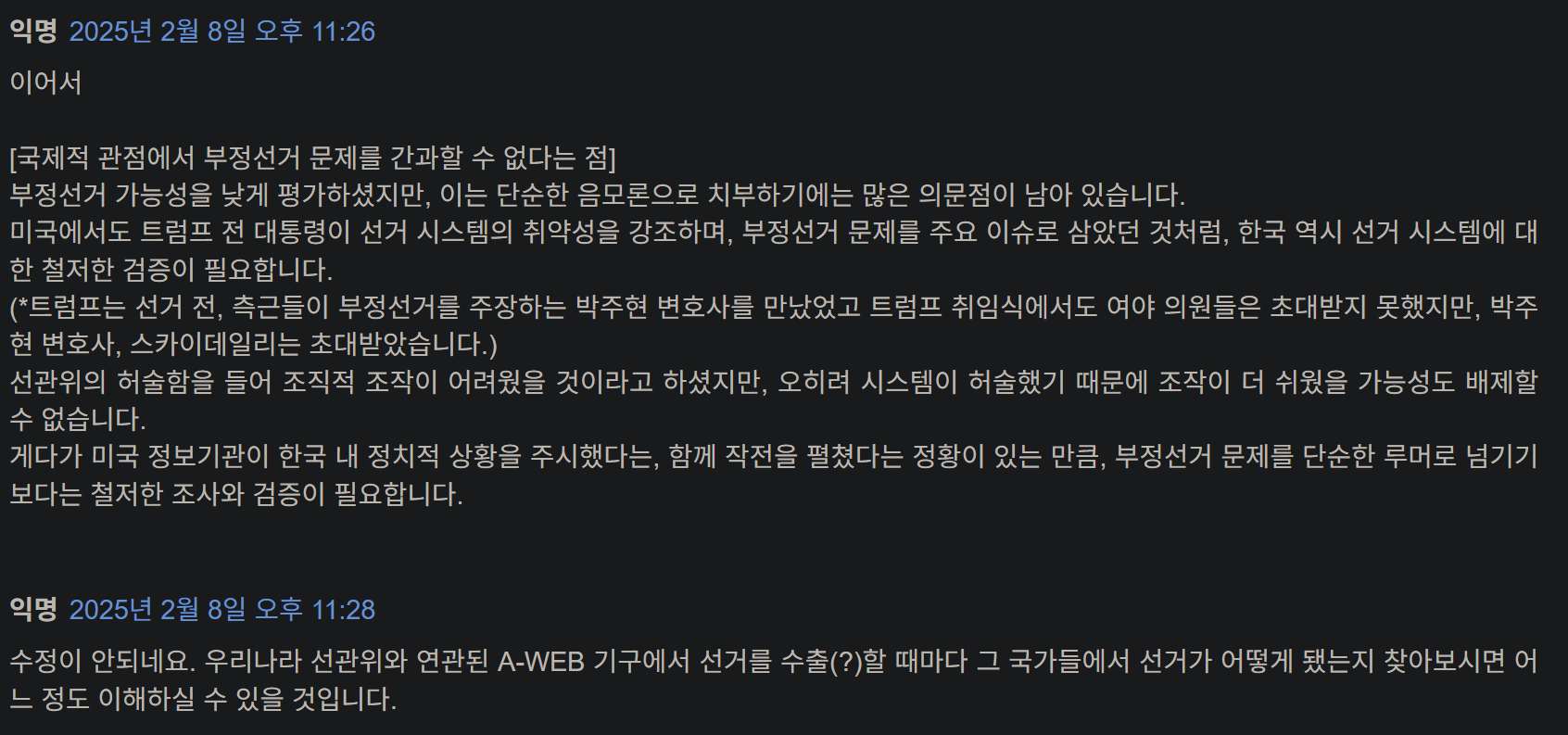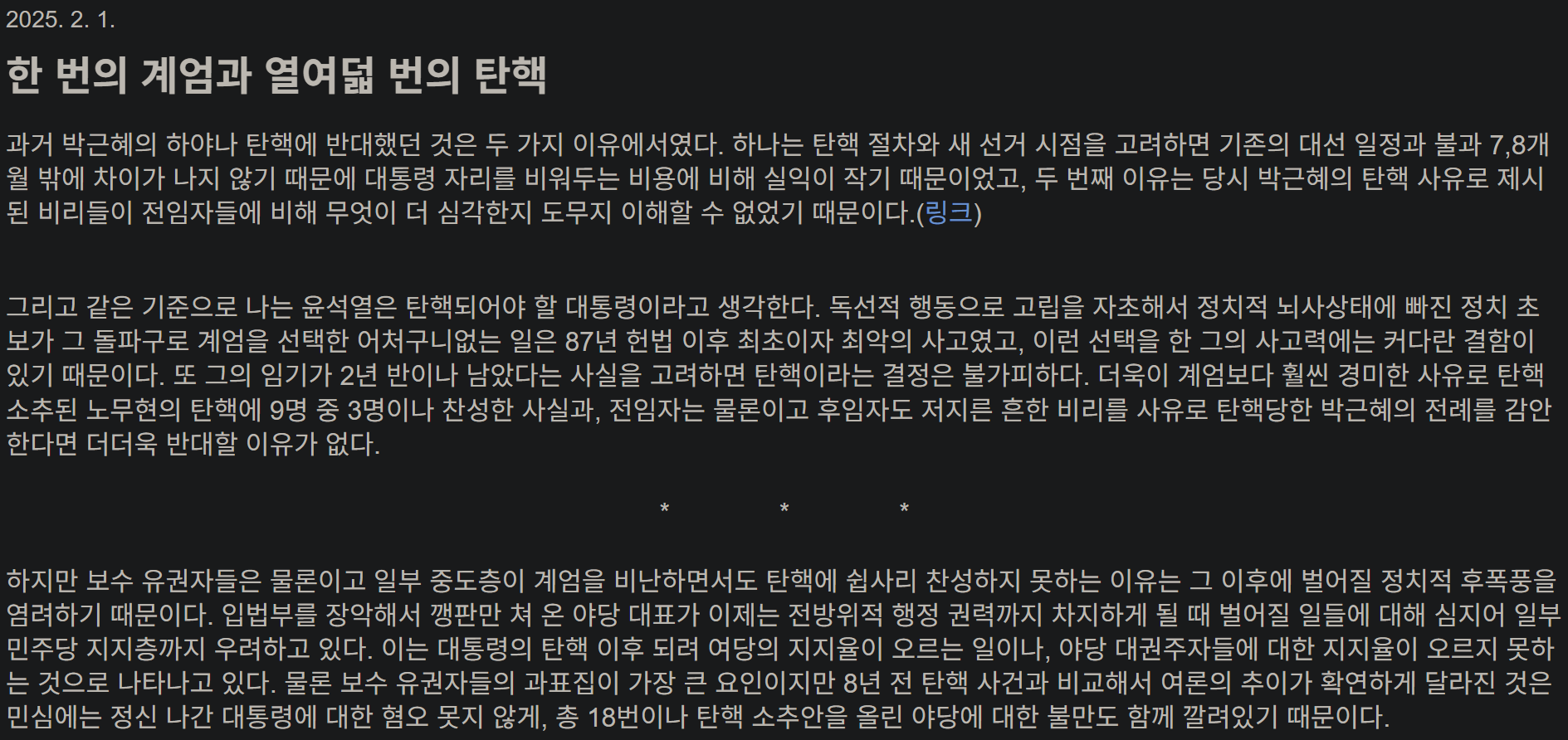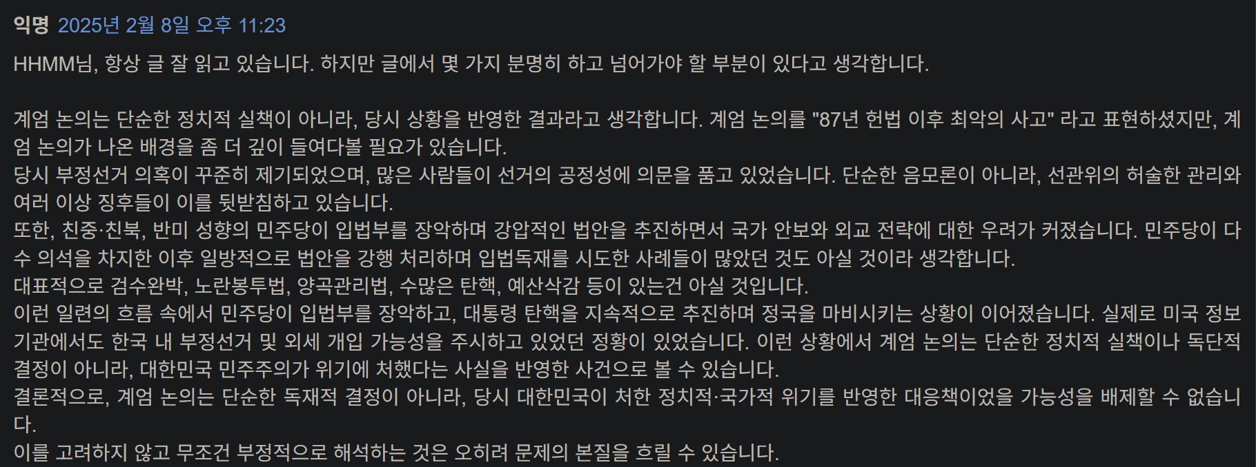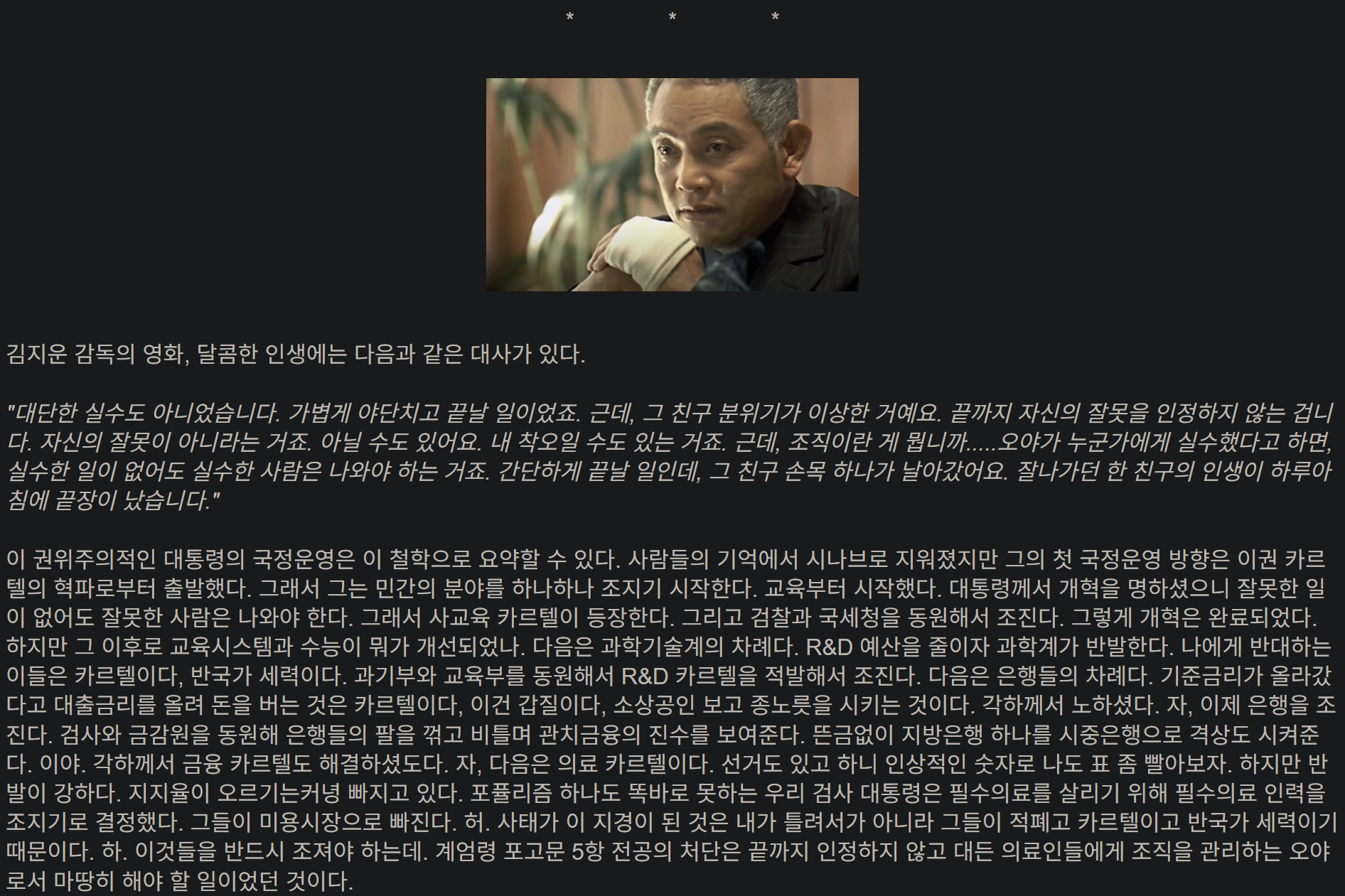 과학적, 합리적, 건설적인 대안보다는 “넌 좌냐 우냐?” 라는 선택을 요구 받아 토론을 위한 광장은 사라지고, 싸움을 위한 링만 남았습니다, 계엄과 같은 파국적 정치행동을 고도의 정치적 수단이라고 표현하는 사람들이 많아 질수록 점점 민주주의에서 멀어져 독재시대로 회귀하는 것이 아닐까 하는 걱정도 듭니다. 그땐 또 한국식 민주주의(K-democracy) 라고 표현하려나요?