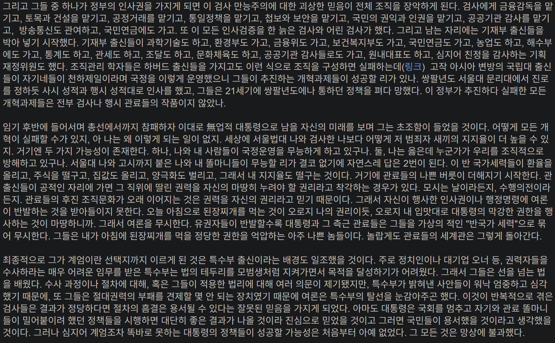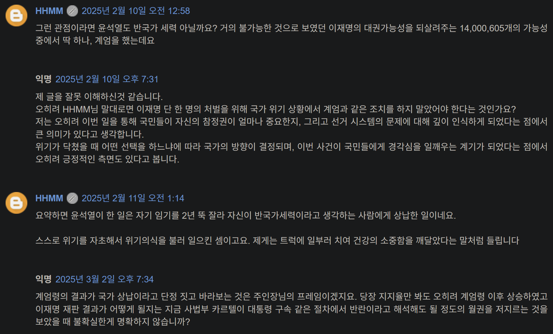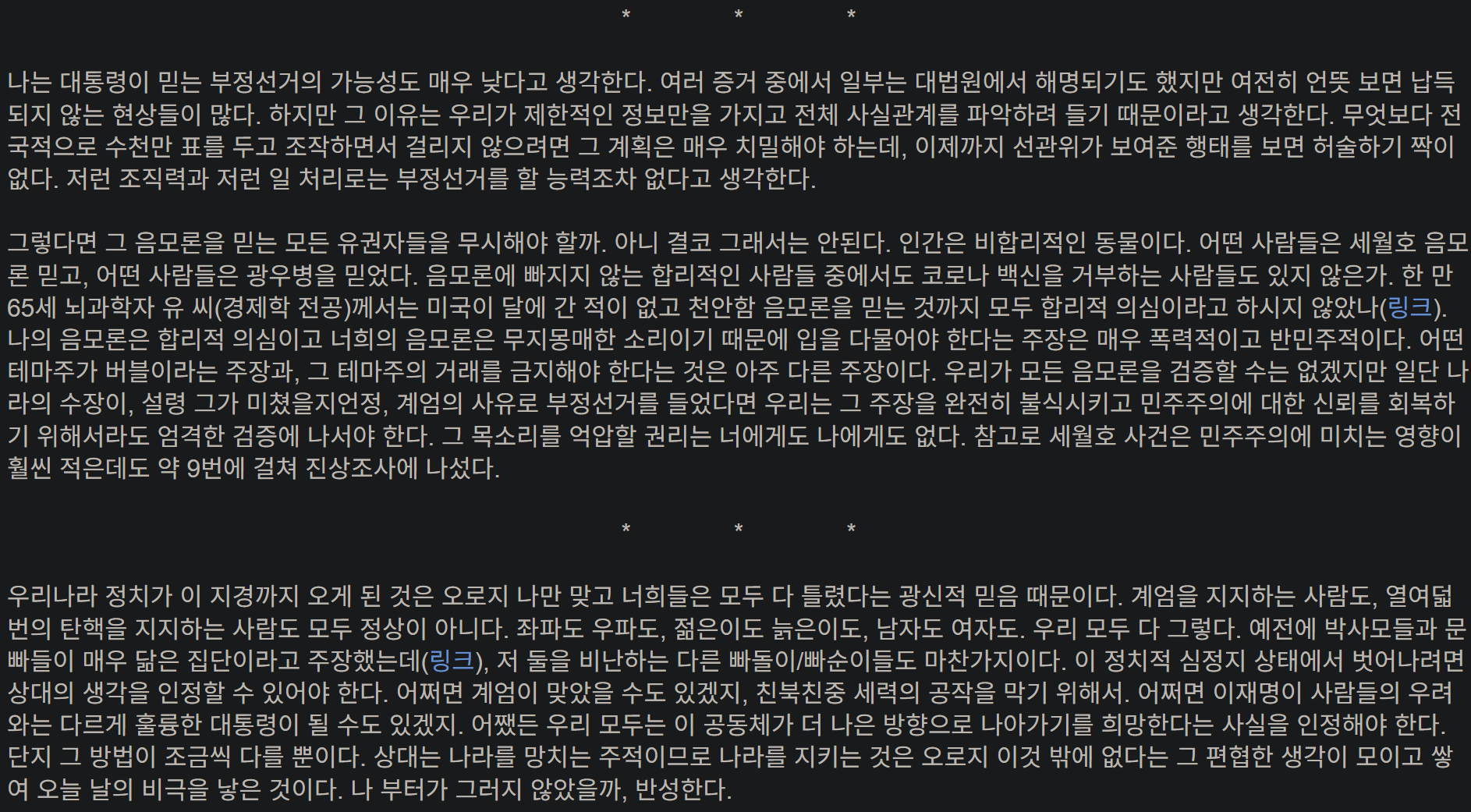 어쩌면 이재명이 사람들의 우려와는 다르게 훌륭한 대통령이 될 수도 있겠지. 어쨌든 우리 모두는 이 공동체가 더 나은 방향으로 나아가기를 희망한다는 사실을 인정해야 한다. 단지 그 방법이 조금씩 다를 뿐이다. 상대는 나라를 망치는 주적이므로 나라를 지키는 것은 오로지 이것 밖에 없다는 그 편협한 생각이 모이고 쌓여 오늘 날의 비극을 낳은 것이다. 나 부터가 그러지 않았을까, 반성한다.