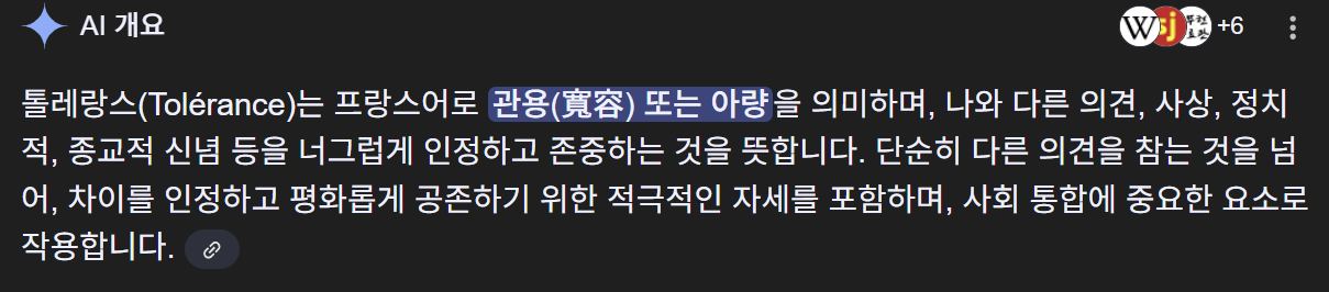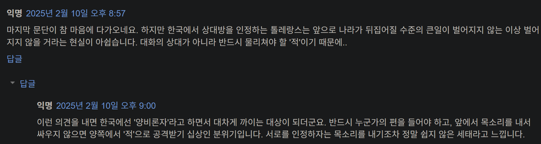 한국에서 상대방을 인정하는 톨레랑스는 앞으로 나라가 뒤집어질 수준의 큰일이 벌어지지 않는 이상 벌어지지 않을 거라는 현실이 아쉽습니다. 대화의 상대가 아니라 반드시 물리쳐야 할 ‘적’이기 때문에..
