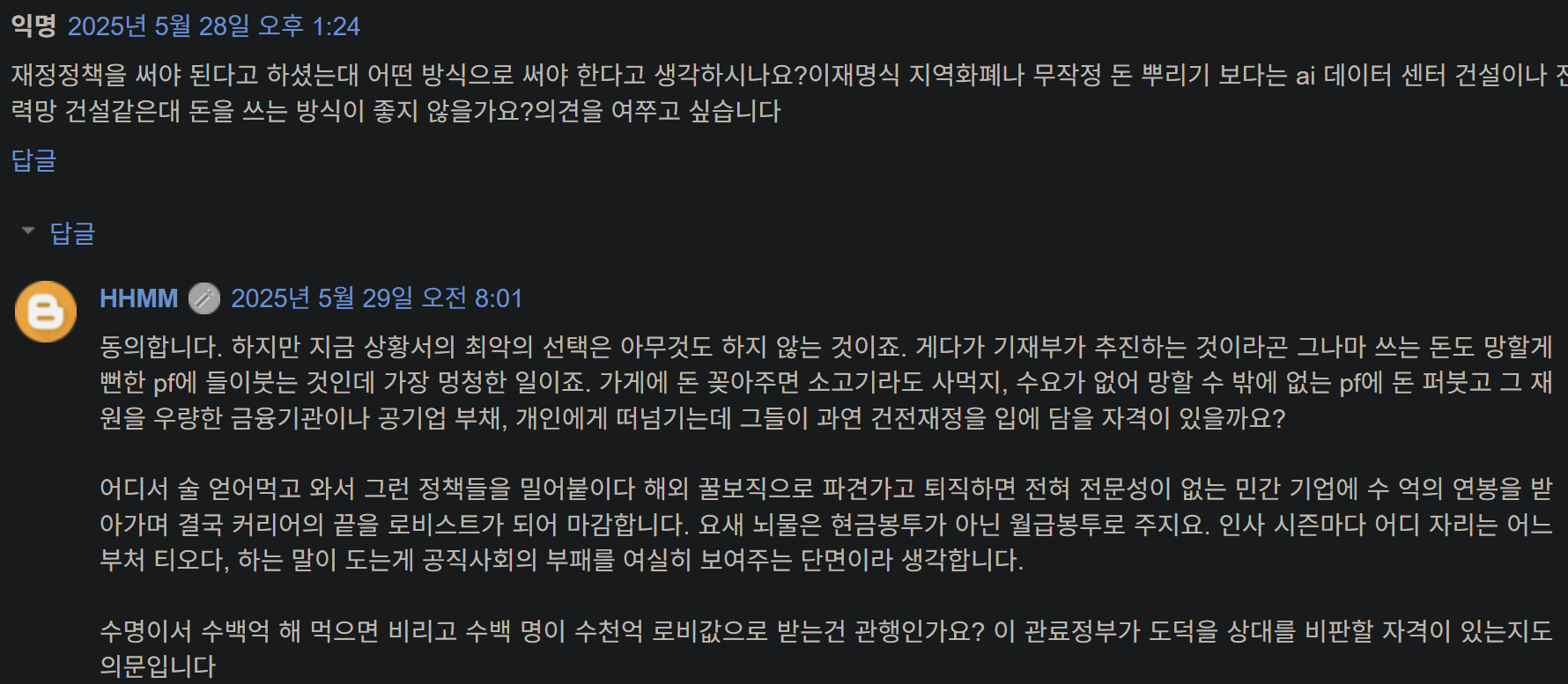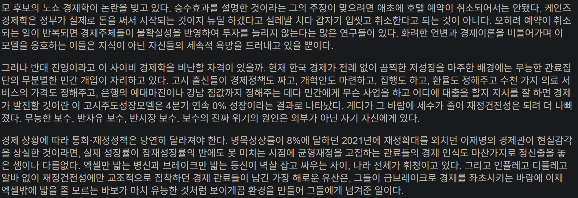 엑셀만 밟는 병신과 브레이크만 밟는 등신이 멱살 잡고 싸우는 사이, 나라 전체가 휘청이고 있다. 그리고 인플레고 디플레고 알바 없이 재정건전성에만 교조적으로 집착하던 경제 관료들이 남긴 가장 해로운 유산은, 그들이 급브레이크로 경제를 좌초시키는 바람에 이제 엑셀밖에 밟을 줄 모르는 바보가 마치 유능한 것처럼 보이게끔 환경을 만들어 그들에게 넘겨준 일이다.