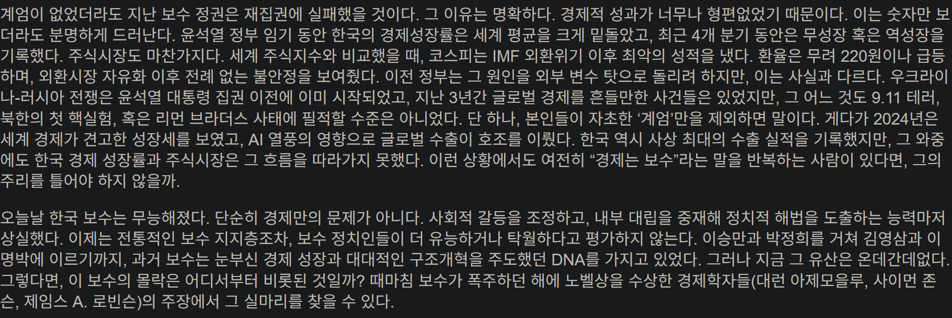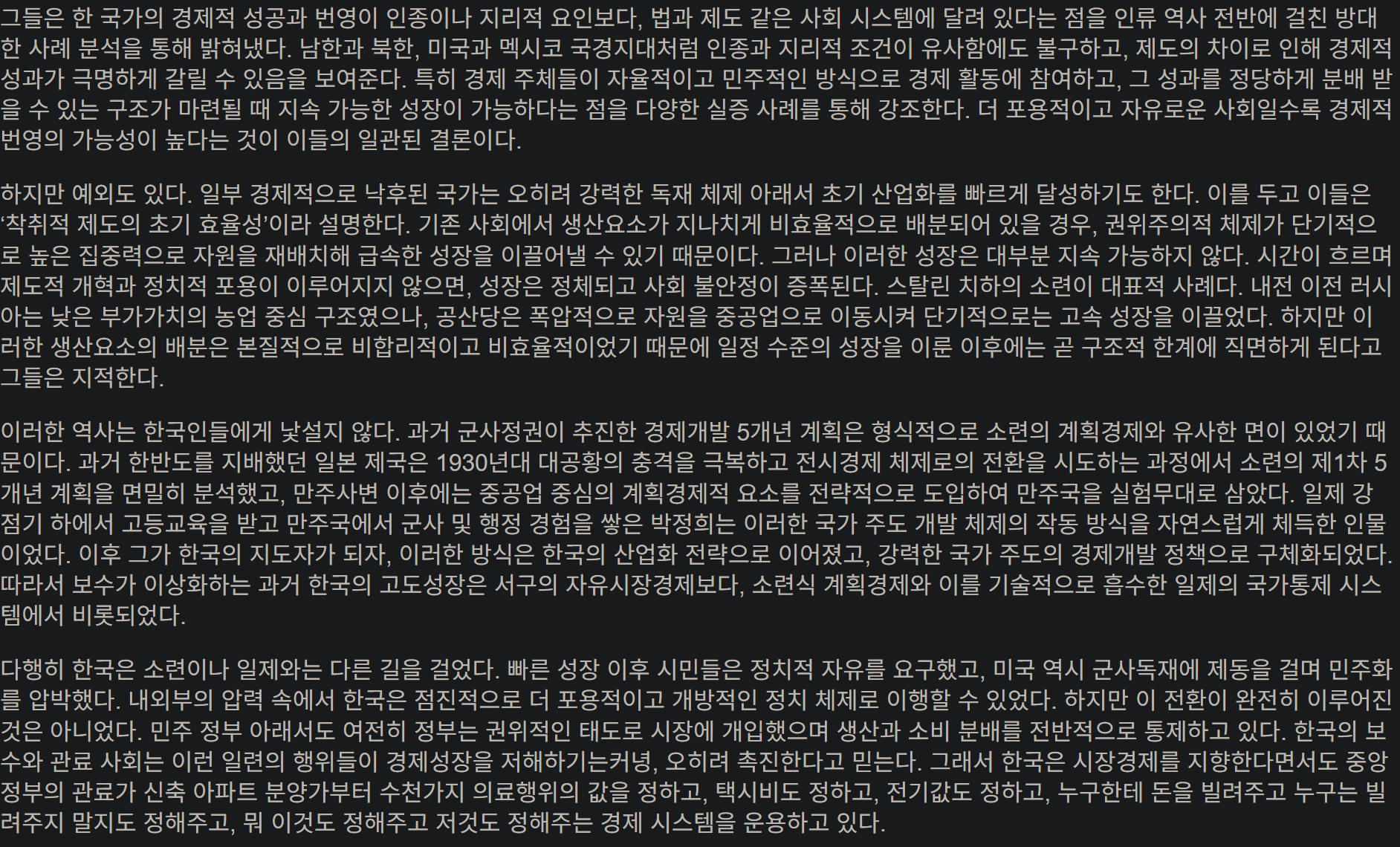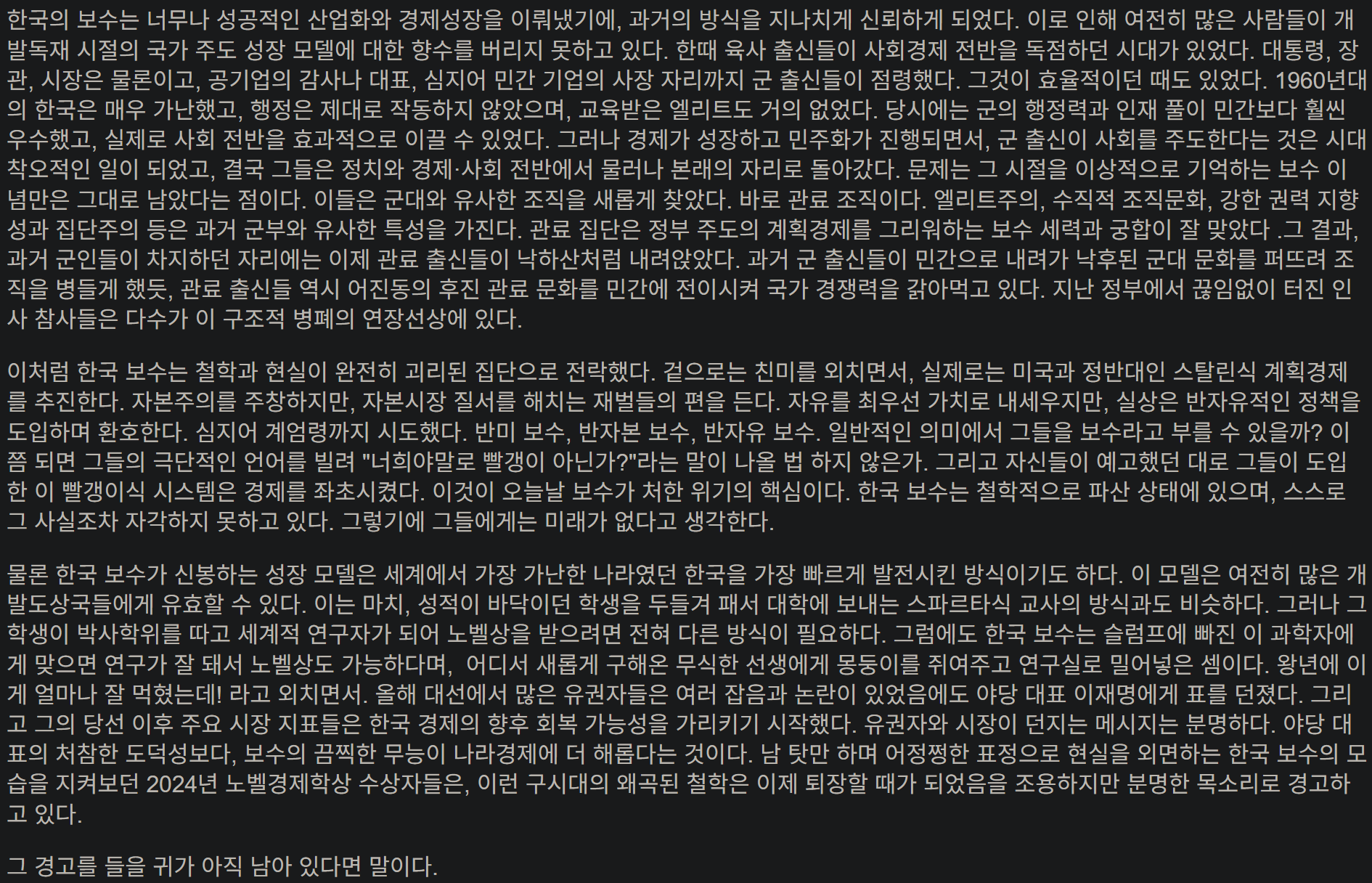 남 탓만 하며 어정쩡한 표정으로 현실을 외면하는 한국 보수의 모습을 지켜보던 2024년 노벨경제학상 수상자들은, 이런 구시대의 왜곡된 철학은 이제 퇴장할 때가 되었음을 조용하지만 분명한 목소리로 경고하고 있다.