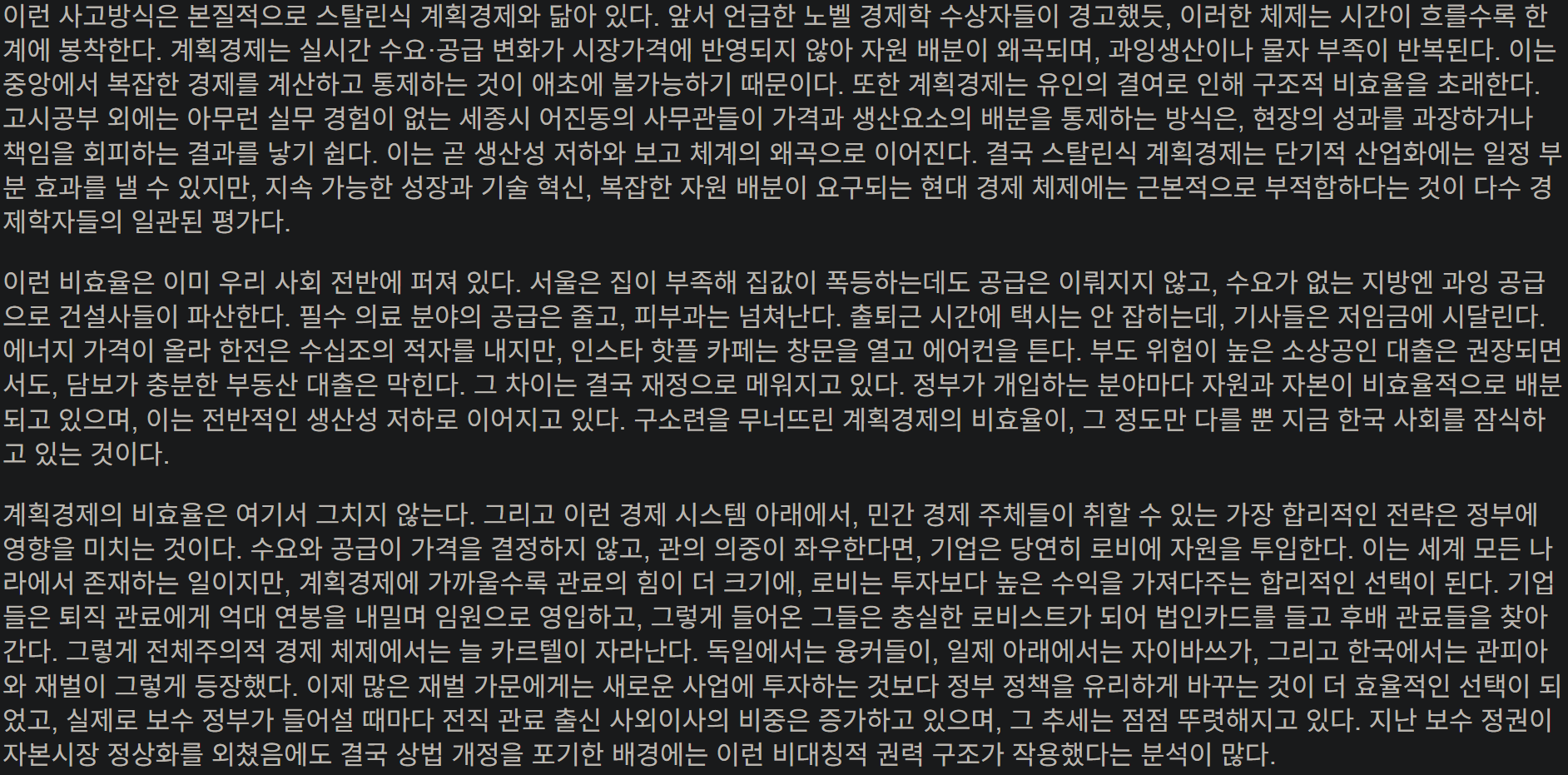 이는 단지 경제적 후퇴에 그치지 않고, 표현의 자유와 지식의 확산, 창의성의 발현까지 억제하여 사회 전반에 걸쳐 활력을 잃게 만든다. 지난 보수 정부의 일련의 정책과 태도는 이러한 경고를 현실로 옮기고 있으며, 마치 구시대적 국가사회주의의 유령이 한국 민주주의의 구조 위를 떠돌고 있는 듯한 인상을 준다
