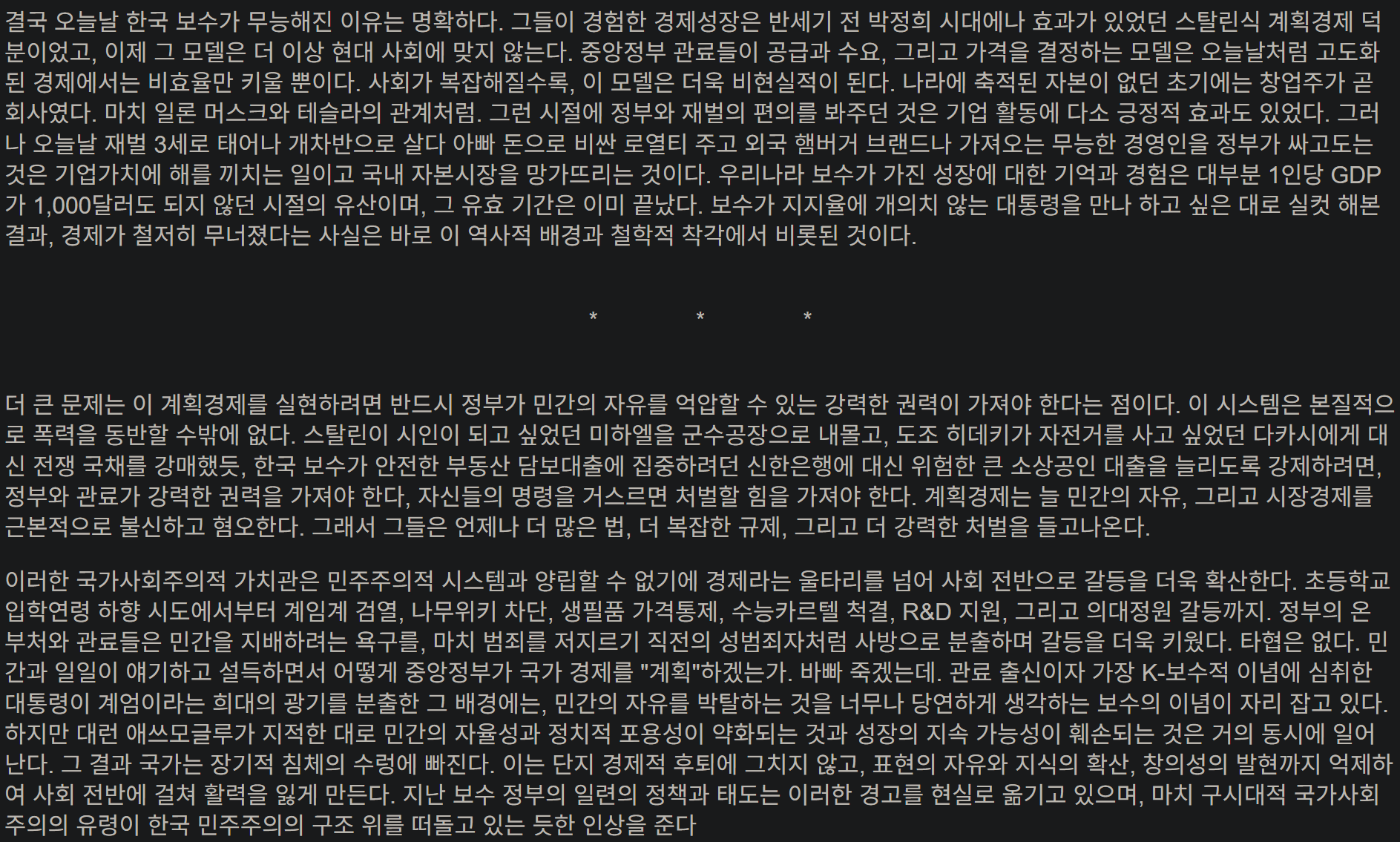 이처럼 한국 보수는 철학과 현실이 완전히 괴리된 집단으로 전락했다. 겉으로는 친미를 외치면서, 실제로는 미국과 정반대인 스탈린식 계획경제를 추진한다. 자본주의를 주창하지만, 자본시장 질서를 해치는 재벌들의 편을 든다. 자유를 최우선 가치로 내세우지만, 실상은 반자유적인 정책을 도입하며 환호한다. 심지어 계엄령까지 시도했다. 반미 보수, 반자본 보수, 반자유 보수. 일반적인 의미에서 그들을 보수라고 부를 수 있을까? 이쯤 되면 그들의 극단적인 언어를 빌려 “너희야말로 빨갱이 아닌가?”라는 말이 나올 법 하지 않은가. 그리고 자신들이 예고했던 대로 그들이 도입한 이 빨갱이식 시스템은 경제를 좌초시켰다. 이것이 오늘날 보수가 처한 위기의 핵심이다. 한국 보수는 철학적으로 파산 상태에 있으며, 스스로 그 사실조차 자각하지 못하고 있다. 그렇기에 그들에게는 미래가 없다고 생각한다.