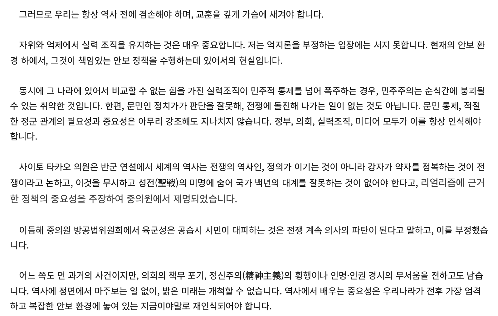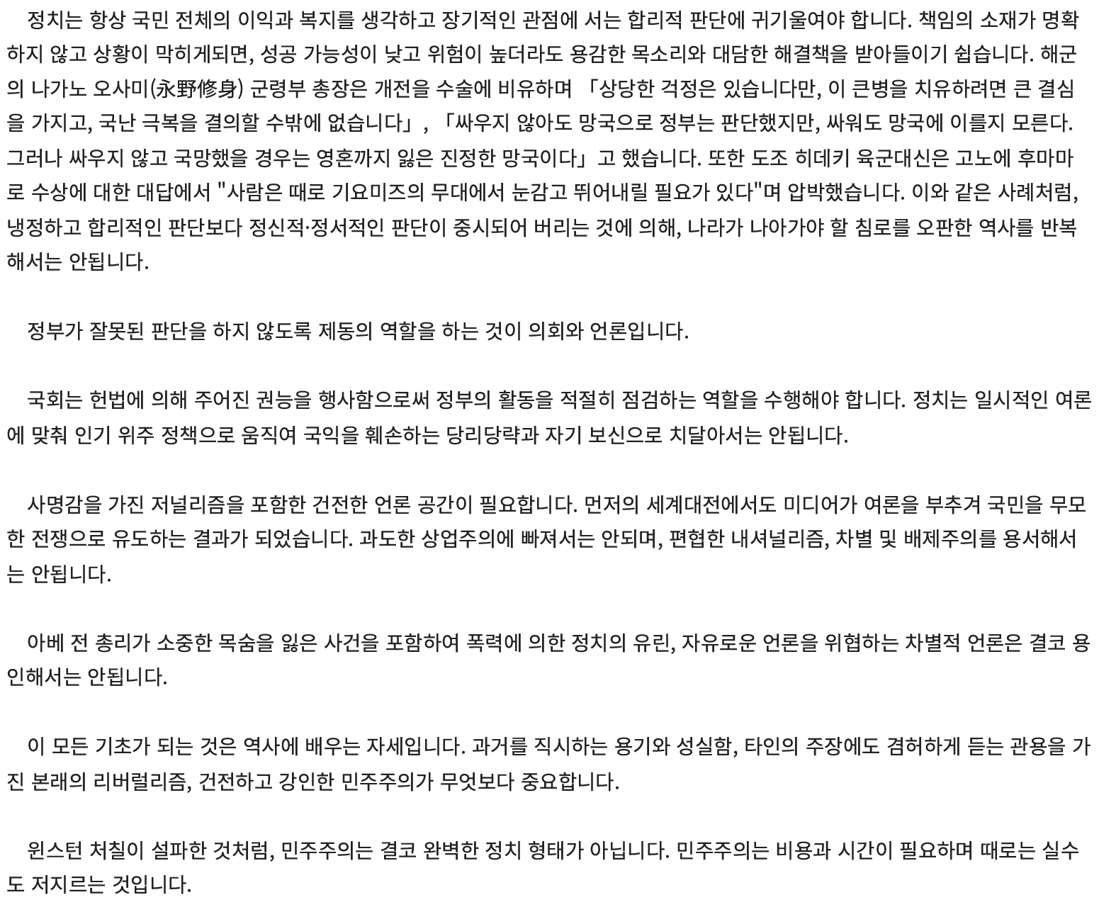 이 모든 기초가 되는 것은 역사에 배우는 자세입니다. 과거를 직시하는 용기와 성실함, 타인의 주장에도 겸허하게 듣는 관용을 가진 본래의 리버럴리즘, 건전하고 강인한 민주주의가 무엇보다 중요합니다.