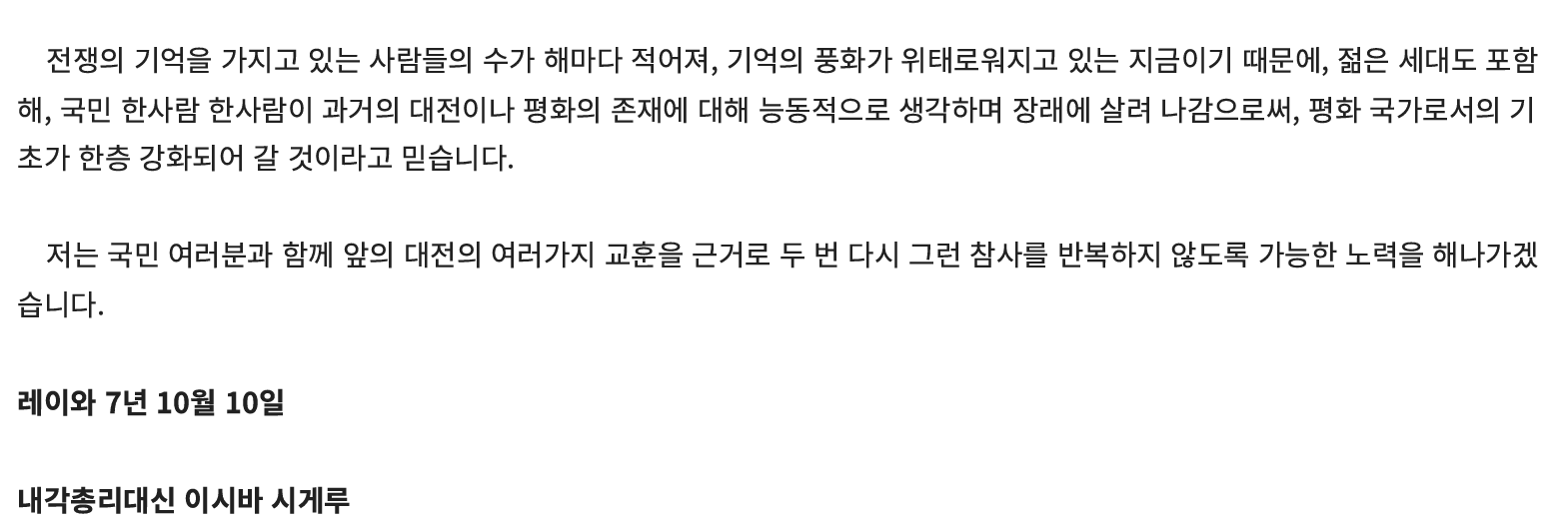 전쟁의 기억을 가지고 있는 사람들의 수가 해마다 적어져, 기억의 풍화가 위태로워지고 있는 지금이기 때문에, 젊은 세대도 포함해, 국민 한사람 한사람이 과거의 대전이나 평화의 존재에 대해 능동적으로 생각하며 장래에 살려 나감으로써, 평화 국가로서의 기초가 한층 강화되어 갈 것이라고 믿습니다.