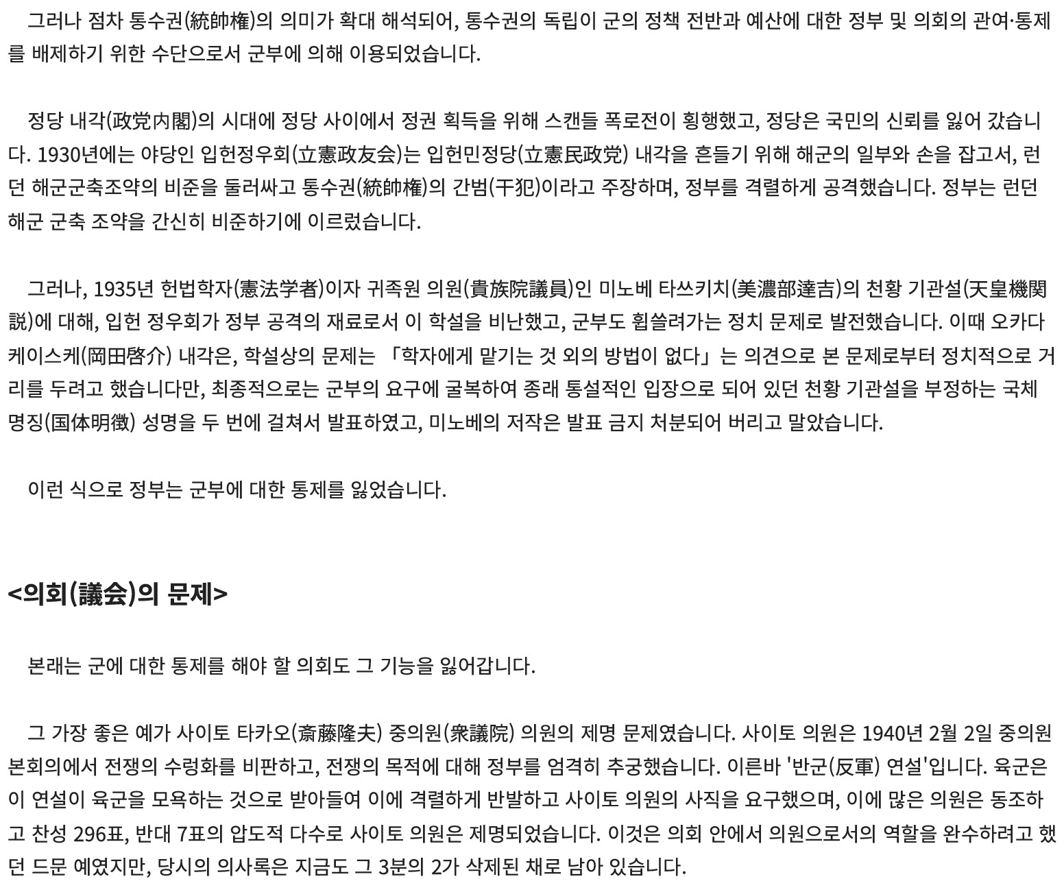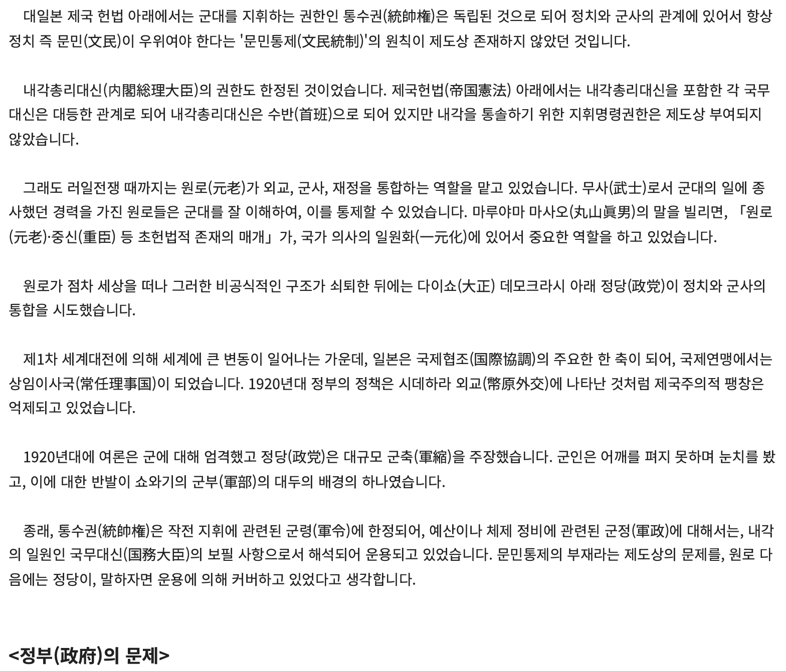대일본 제국 헌법 아래에서는 군대를 지휘하는 권한인 통수권(統帥権)은 독립된 것으로 되어 정치와 군사의 관계에 있어서 항상 정치 즉 문민(⽂⺠)이 우위여야 한다는 ‘문민통제(⽂⺠統制)’의 원칙이 제도상 존재하지 않았던 것입니다