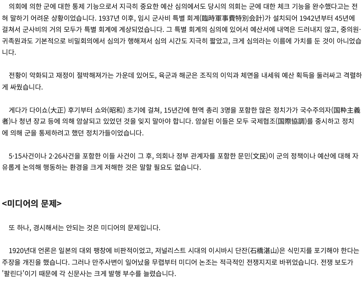 동시에 그 나라에 있어서 비교할 수 없는 힘을 가진 실력조직이 민주적 통제를 넘어 폭주하는 경우, 민주주의는 순식간에 붕괴될 수 있는 취약한 것입니다. 한편, 문민인 정치가가 판단을 잘못해, 전쟁에 돌진해 나가는 일이 없는 것도 아닙니다. 문민 통제, 적절한 정군 관계의 필요성과 중요성은 아무리 강조해도 지나치지 않습니다. 정부, 의회, 실력조직, 미디어 모두가 이를 항상 인식해야 합니다.