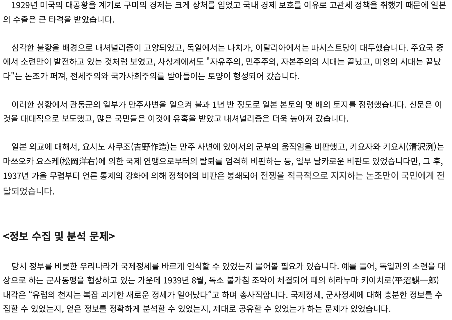 제1차 세계대전을 거쳐, 세계가 총력전(総⼒戦)의 시대에 들어가 있던 가운데에, 개전 전에 내각이 설치한 「총력전 연구소(総⼒戦研究所)」나 육군성이 설치한 소위 「아키마루 기관(秋丸機関)」등의 예측에 의하면, 패전은 필연이었습니다. 많은 지식인들은 전쟁 수행이 곤란하다는 것을 느꼈습니다. 정부 및 군부의 수뇌진도 그것을 인식했지만, 왜 전쟁을 회피하겠다는 결단을 할 수 없는 채, 무모한 전쟁에 돌진해 국내외의 많은 무고한 생명을 희생하는 결과가 되어 버렸는가. 요나이 미쓰마사(⽶内光政) 전 총리의 ‘천천히 가난해지는 것(ジリ貧)을 피하려고 갑자기 망하는 것(ドカ貧)이 되지 않도록 주의 바랍니다’라는 지적도 있었던 가운데 왜 큰 노선은 바뀌지 못했는가.