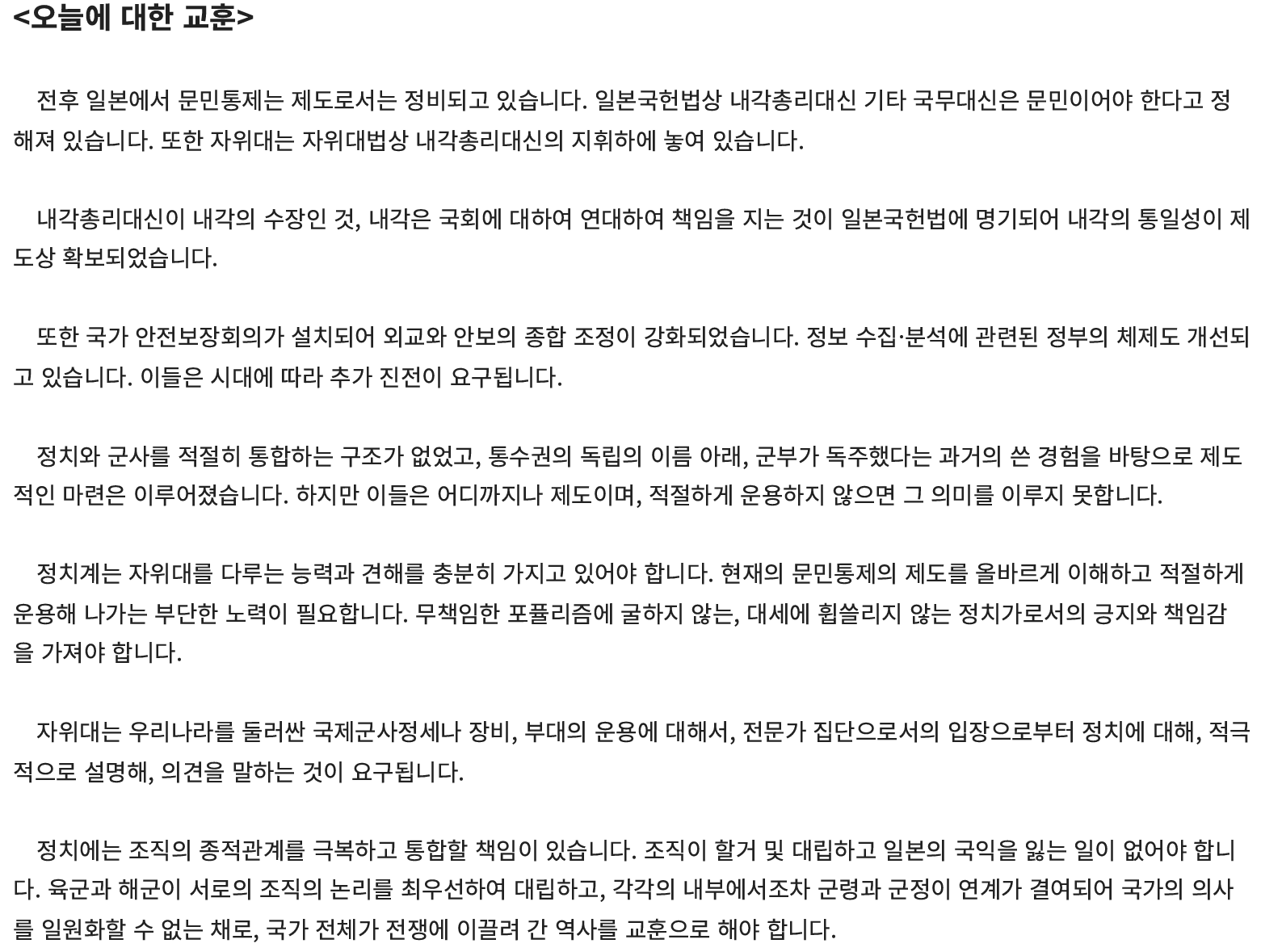 정치계는 자위대를 다루는 능력과 견해를 충분히 가지고 있어야합니다. 현재의 문민통제의 제도를 올바르게 이해하고 적절하게 운용해나가는 부단한 노력이 필요합니다. 무책임한 포퓰리즘에 굴하지 않는, 대세에 휩쓸리지 않는 정치가로서 긍지와 책임감을 가져야합니다.