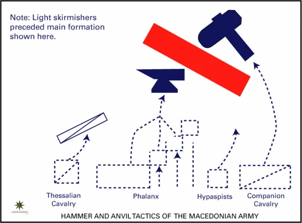알렉산더 대왕은 이 개념을 아버지 필리포스 2세로부터 물려받아, 마케도니아 팔랑크스(모루)와 그의 헤타이로이 기병(망치)을 결합한 제병합동 전술로 이를 완성했다. 그는 수적 열세에도 불구하고 이수스 전투와 가우가멜라 전투에서 페르시아 군대를 격파하는 데 이 전술을 사용했다.