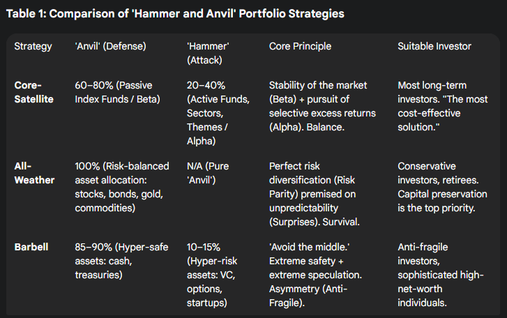 이 ‘망치와 모루’ 구조는 “모든 것을 방어하는 자는 아무것도 방어하지 못한다”(나폴레옹)와 “결정적 지점에 전력을 집중하라”(클라우제비츠)는 두 가지 상충되는 군사 원칙을 동시에 만족시키는 유일한 해법이다. ‘모루'(코어/올웨더)는 생존을 보장하기 위해 ‘모든 것을 방어하는'(시장 베타 / 4계절) 역할을 맡는다. 동시에 ‘망치'(새틀라이트/바벨)는 승리를 추구하기 위해 ‘결정적 지점에 전력을 집중'(알파 / 비대칭 수익)한다. 이 구조는 ‘생존’과 ‘승리’라는 두 가지 상충되는 목표를 하나의 포트폴리오 내에서 분리하고 동시에 달성한다.