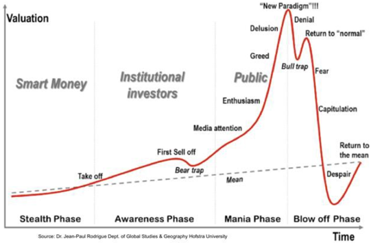 경제학자 하이먼 민스키(Hyman Minsky)[^4]는 거품의 생애 주기를 5단계로 정의했는데, 이는 공세종말점으로 가는 로드맵으로 볼 수 있다: