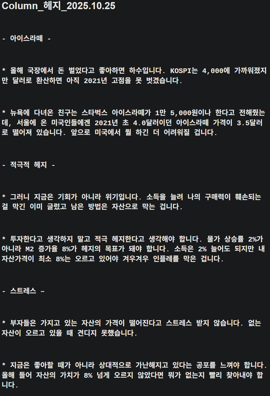 투자한다고 생각하지말고 적극 헤지한다고 생각해야 합니다. 물가 상승률이 2%가 아니라 M2 증가율 8%가 헤지의 목표가 되야합니다. 소득은 2% 늘어도 되지만 내 자산가격이 최소 8%는 오르고 있어야 겨우겨우 인플레를 막은겁니다.