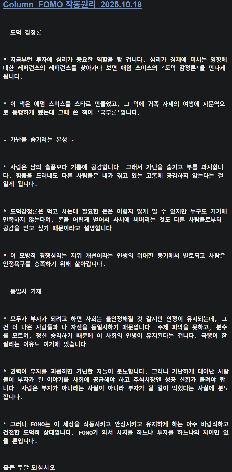 지금부턴 투자에 심리가 중요한 역할을 할 겁니다. 심리가 경제에 미치는 영향에 대한 레퍼런스의 레퍼런스를 찾아가다 보면 애덤스미스의 ‘도덕 감정론’을 만나게 됩니다.