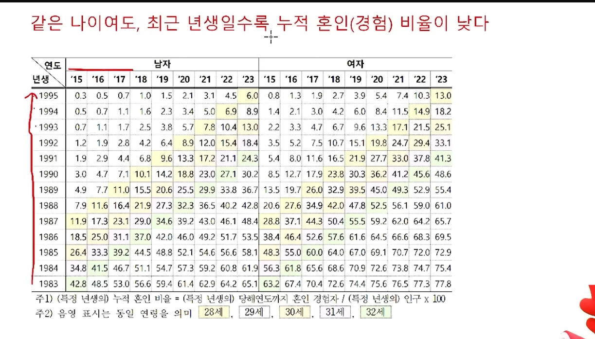 같은 나이여도, 최근 년생일수록 누적 혼인(경험) 비율이 낮다.