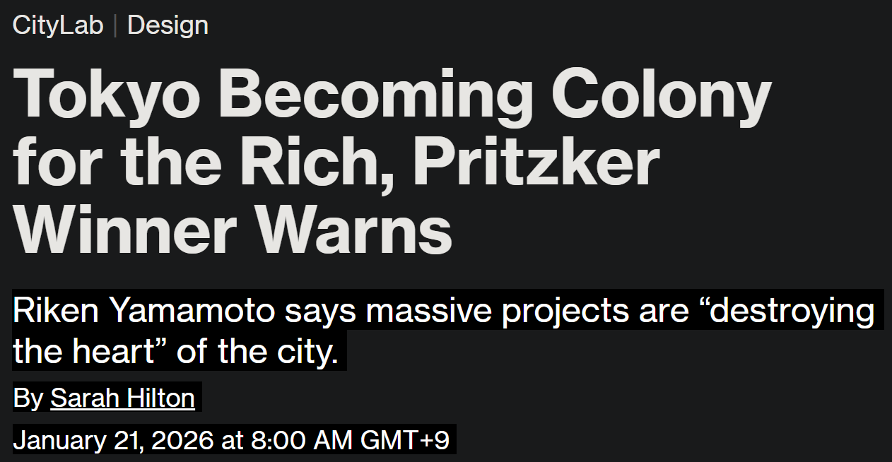 “이건 부자들, ‘신자유주의자’ 사람들이 만든 식민지 같은 거예요.” 2024년 프리츠커상(건축계의 노벨상으로도 불림) 수상자인 리켄 야마모토는 최근 일본외신기자클럽(FCCJ) 강연에서 이렇게 말했다. “지어지는 것들이 지역 공동체 사람들에겐 완전히 쓸 수 없는 것들입니다.”