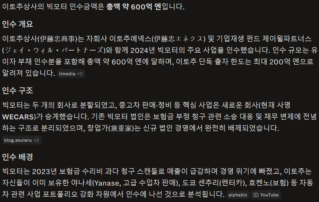 기존 빅모터의 중고차, 정비 사업을 신생회사 WECARS(이토추)에 넘기고 기존 빅모터 법인은 BALM으로 변경하여 소송 대응, 손해배상, 채무 변제에 전념하게 된다는데