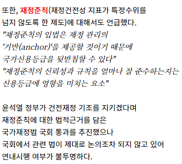 - 심각한 복합 위기의 가능성을 우려하고 있다”면서도 “‘모든 구름엔 은빛으로 빛나는 부분이 있다’(Every cloud has a silver lining, 모든 악재에는 희망적인 부분도 있다는 뜻의 미 속담)란 말이 있듯이 한국 경제가 어려운 상황을 지나는 가운데서도 희망적인 부분을 찾을 수 있다고 생각하고, 우리는 그렇게 해야 할 것”이라고 했다.
