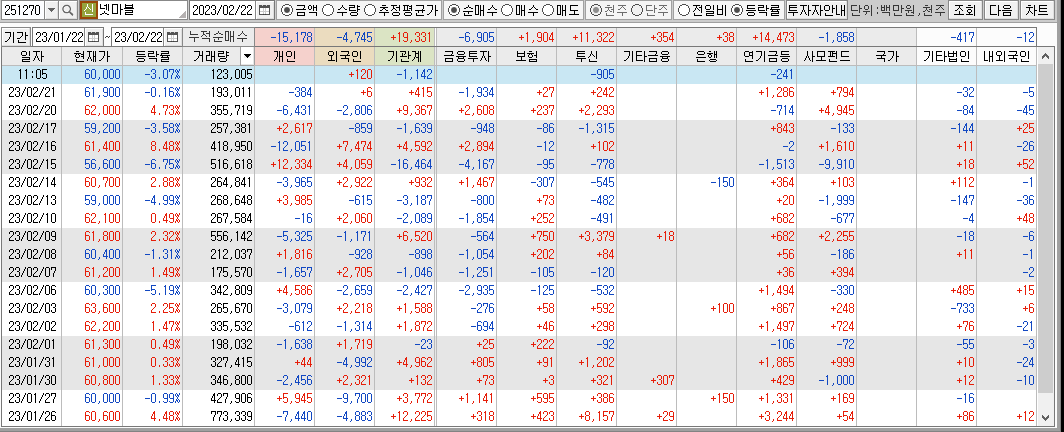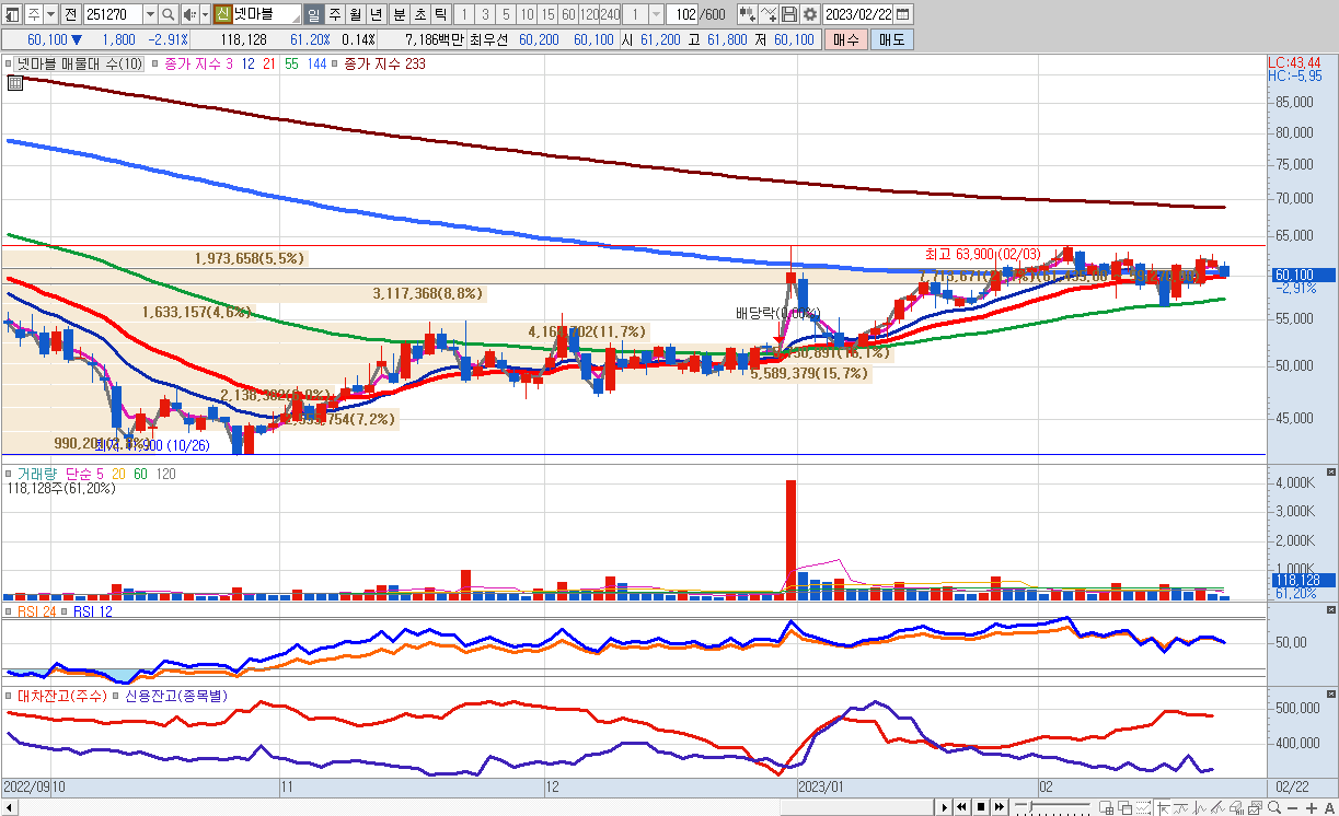 게임주들이 전체적으로 최근에 돈이 한번 돌았는데 개인적인 생각으로는 넷마블은 아직 슈팅이 안나왔는데 한 번쯤은 나오지 않을까요? 물론 RSI상으로 좋은 그림은 안나오고 있습니다.